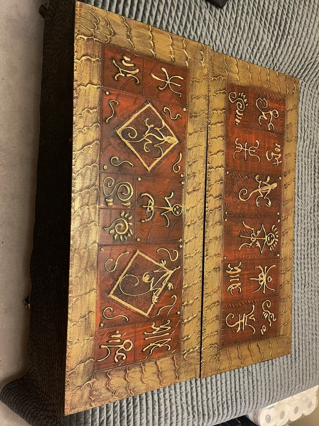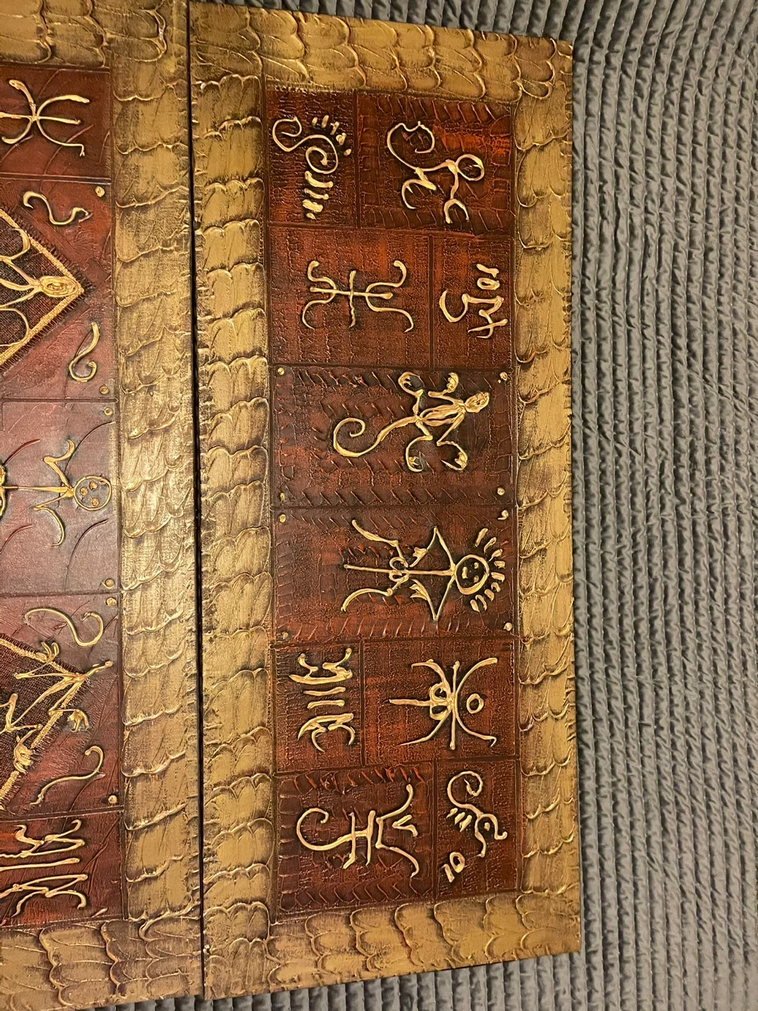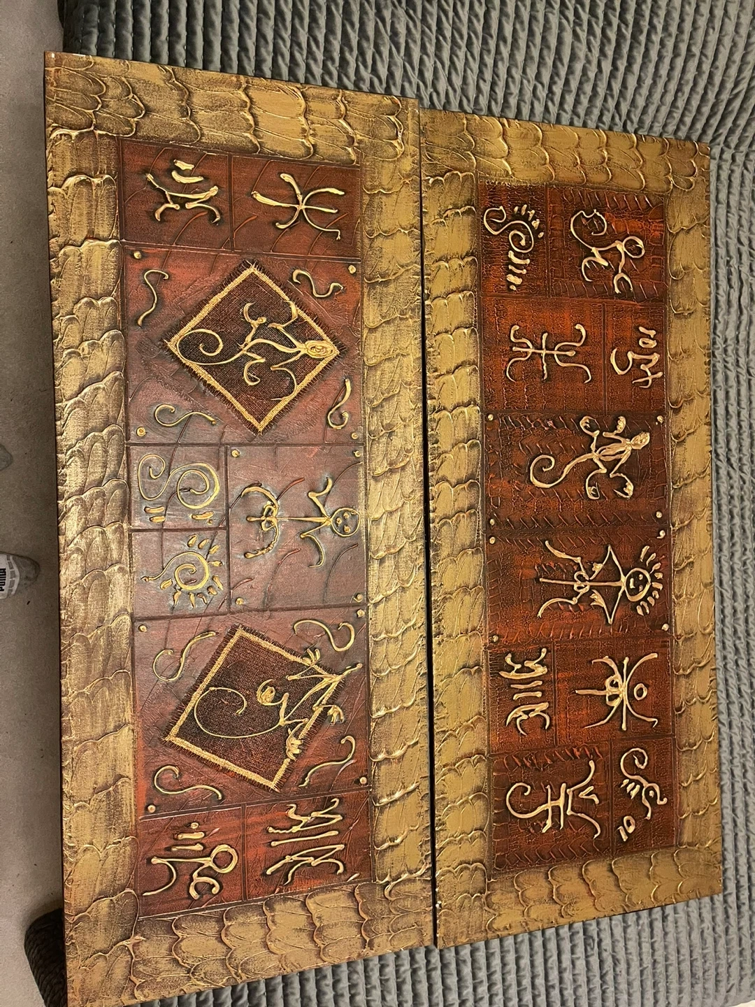 Two decorative wall hangings featuring a rustic, textured design with embossed symbols. Each piece measures approximately 24 inches tall by 10 inches wide. They come with hanging wires attached.