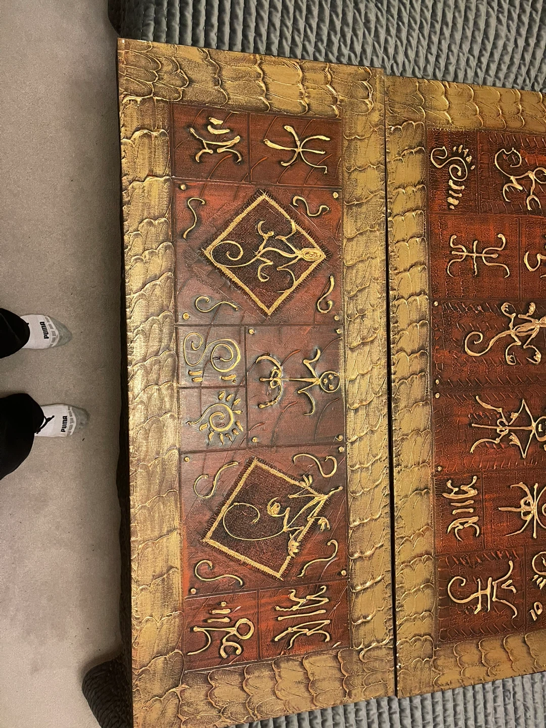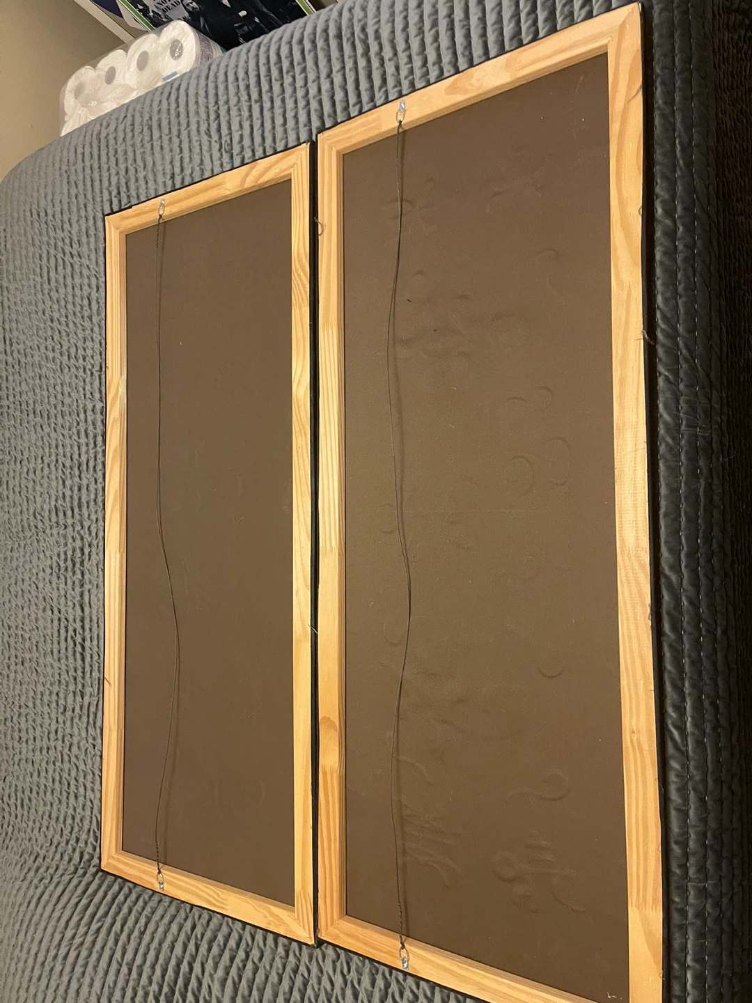 Two decorative wall hangings featuring a rustic, textured design with embossed symbols. Each piece measures approximately 24 inches tall by 10 inches wide. They come with hanging wires attached.