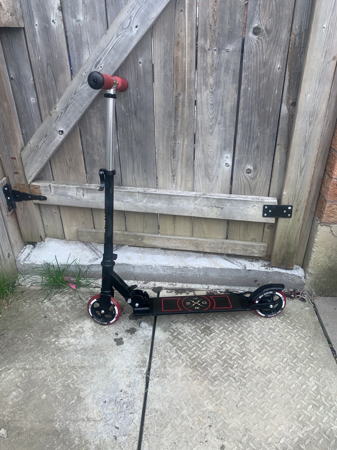 Black scooter with red accents. Features a foldable design. Suitable for children. Wheels appear to be in good condition.