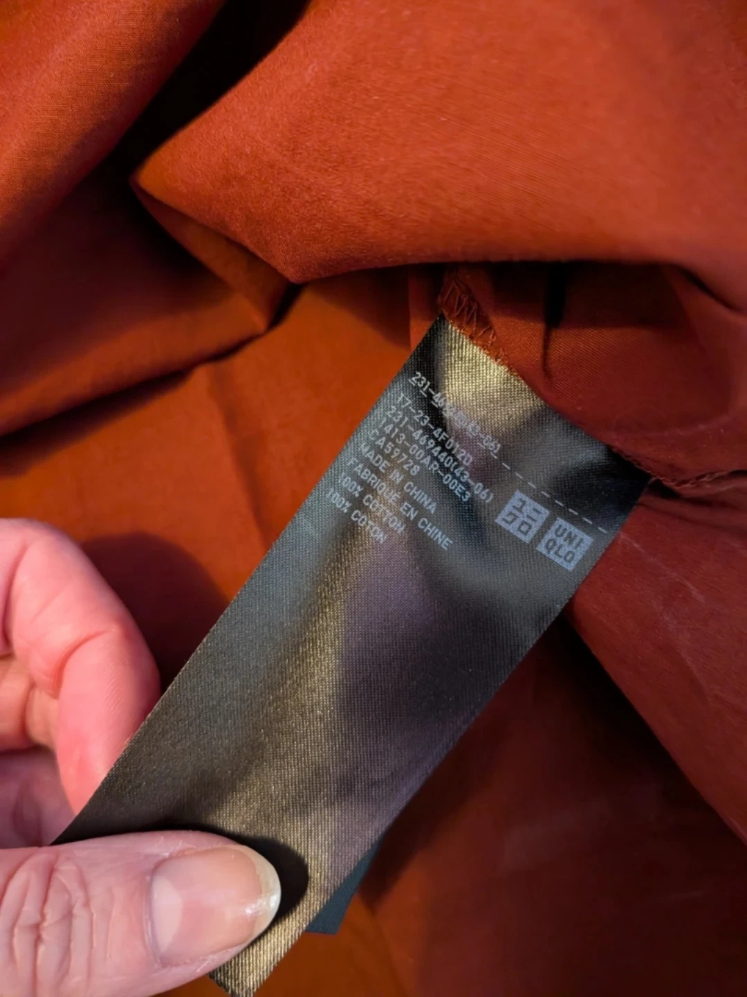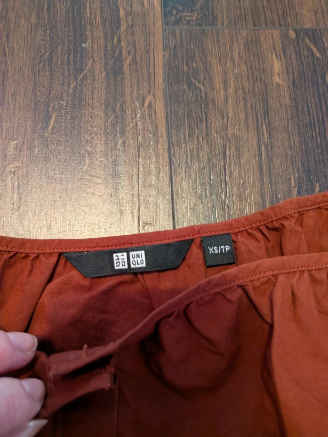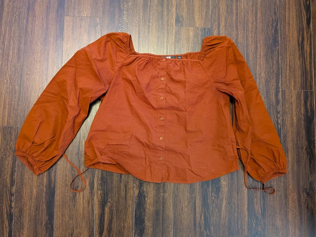 This UNIQLO blouse features a rust-coloured hue and a flattering square neckline. It's made of 100% cotton and has long, billowy sleeves with elasticated cuffs. Adjustable ties at the hem allow for a customized fit. This top is perfect for casual outings or can be dressed up for a more polished look.