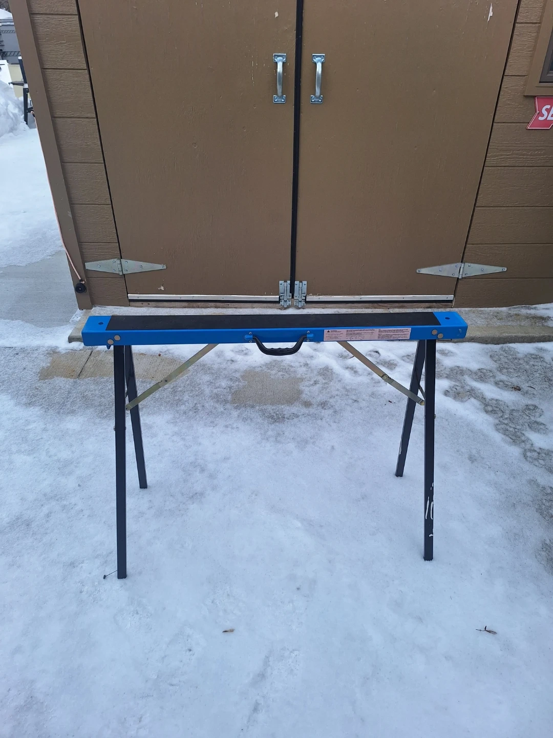 This portable sawhorse work table is great for various projects. It's made with a durable metal frame and both have wood upgraded tops for stability. It's easily foldable for transport and storage. This sawhorse is perfect for DIY enthusiasts and professionals needing a convenient workspace.
