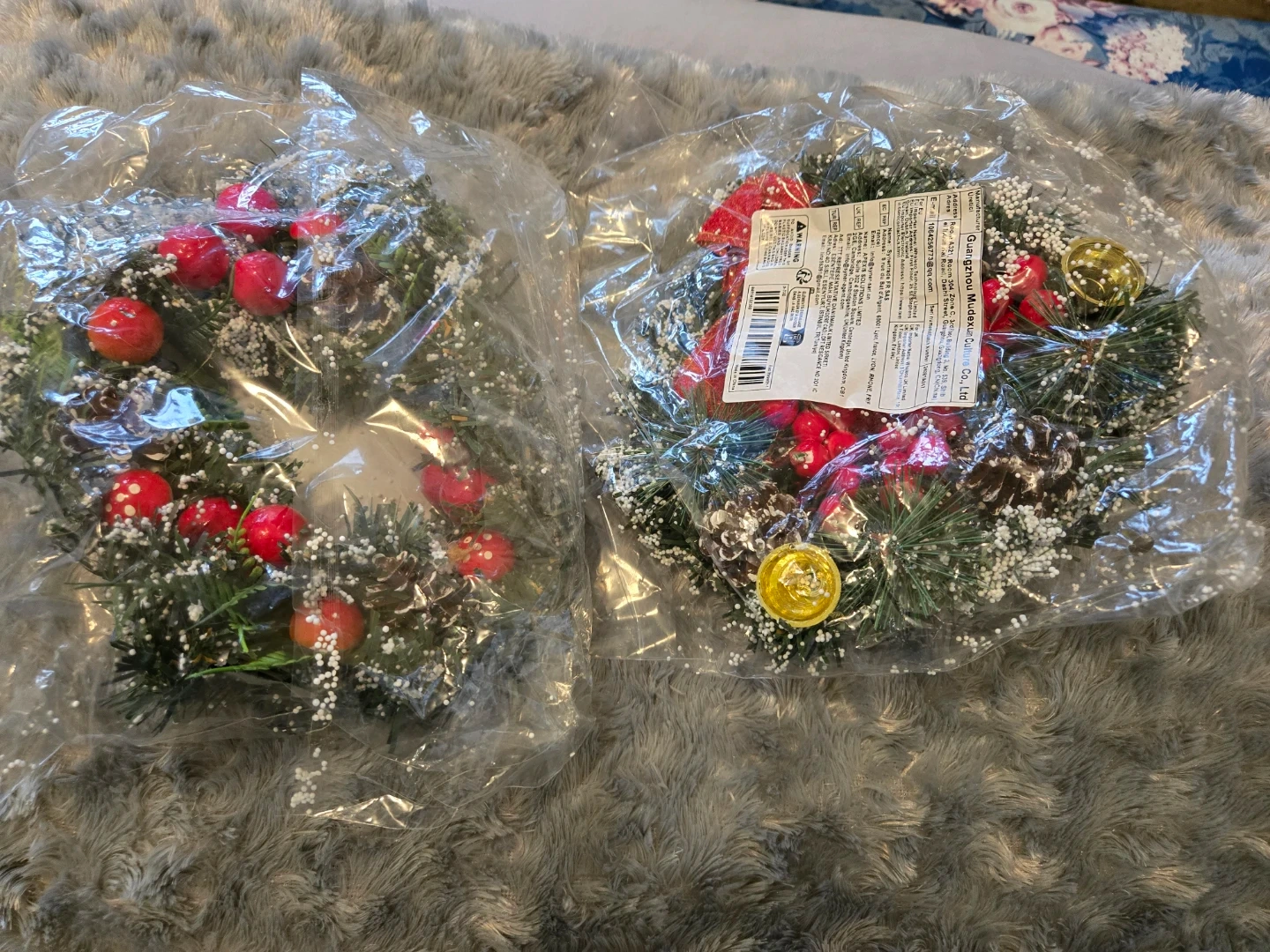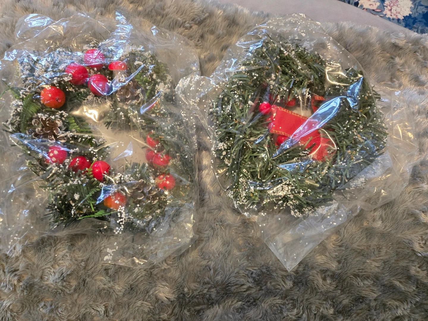 It's about 20cm in diameter and features a lovely red bow, pinecones, red berries, and a touch of snow.