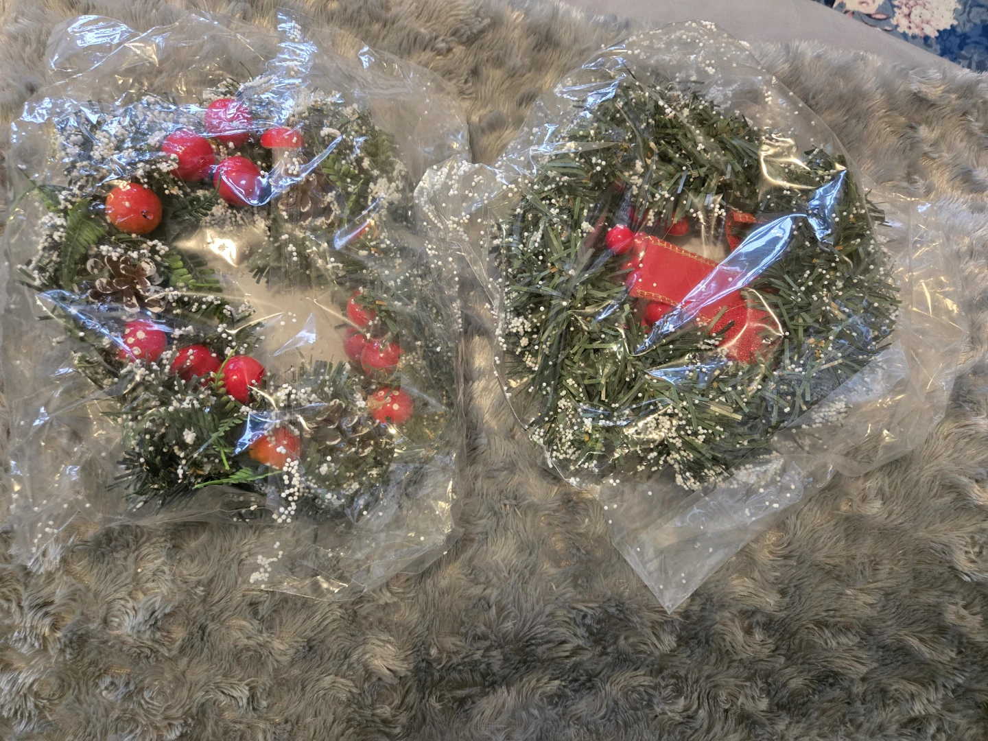 It's about 20cm in diameter and features a lovely red bow, pinecones, red berries, and a touch of snow.