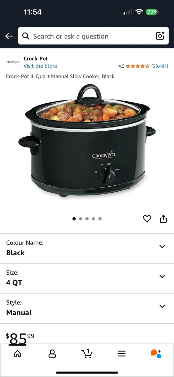 I'm selling a Crock-Pot slow cooker in black. It's a 4-quart manual model, perfect for cooking up delicious meals! It comes with the lid and the original packaging. Originally bought for $85.99