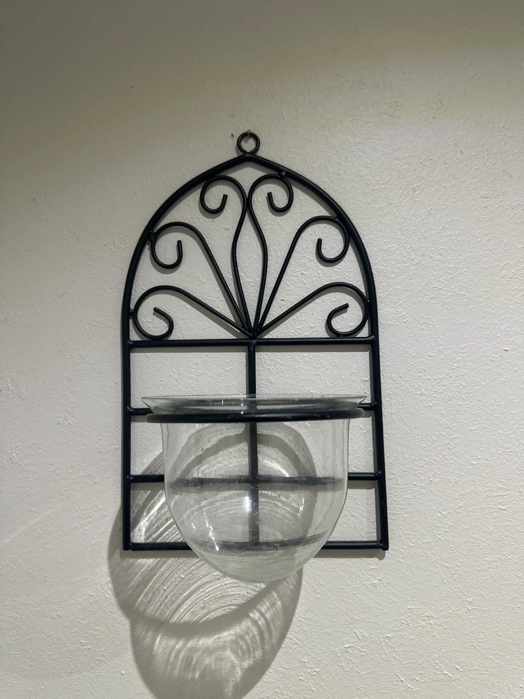 This wall planter features a decorative black metal frame with a clear glass bowl. It's designed for hanging on a wall, perfect for small plants or decorative items.