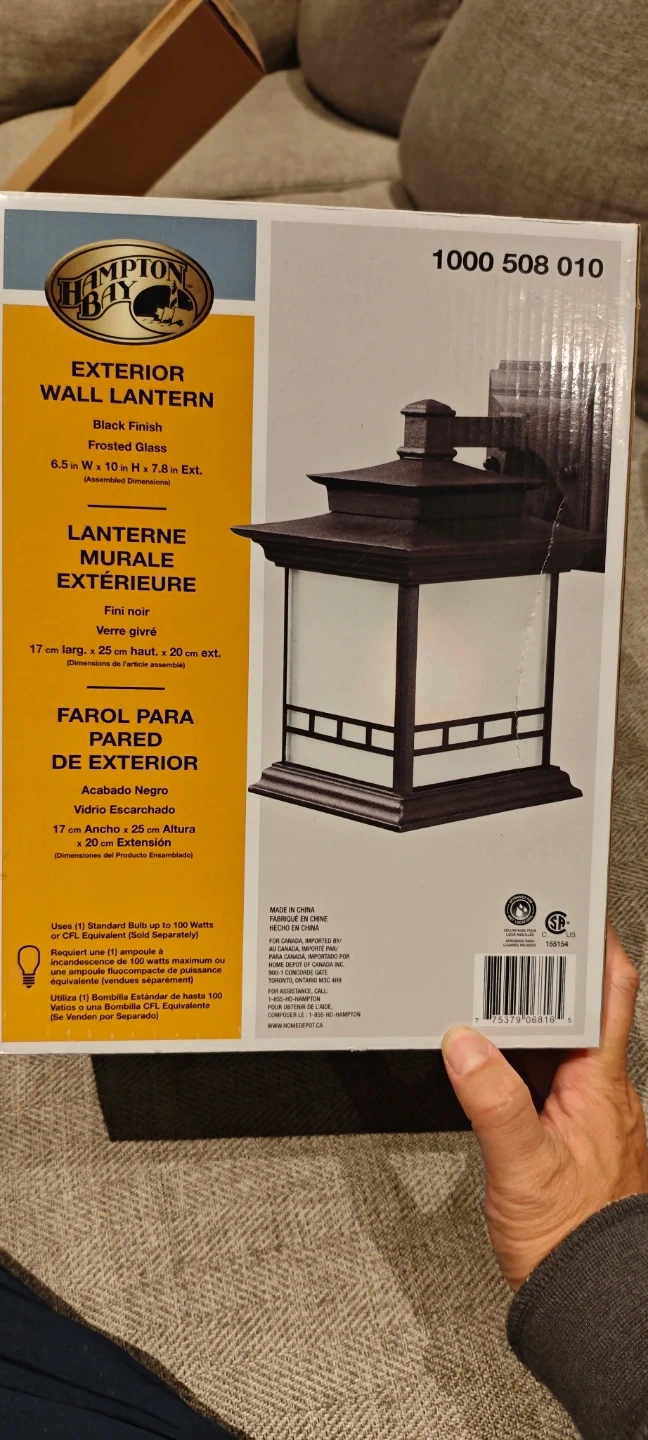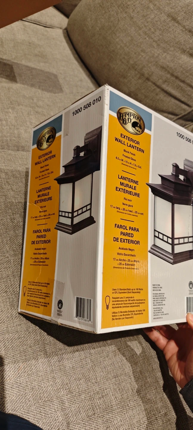 Selling a Hampton Bay exterior wall lantern in black finish! It comes in its original box. The lantern features frosted glass and measures approximately 6.5 inches in width, 10 inches in depth, and 7.8 inches in height (17 cm x 25 cm x 20 cm). Perfect for adding a touch of style to your outdoor space!