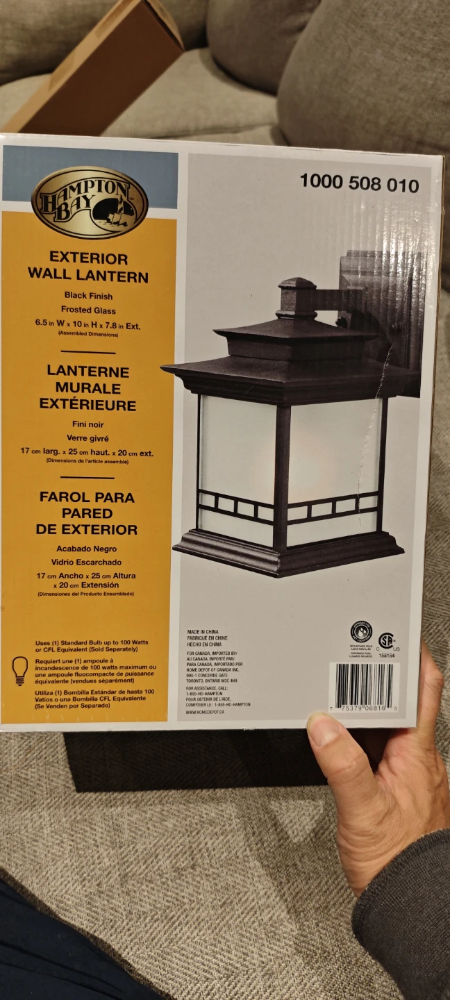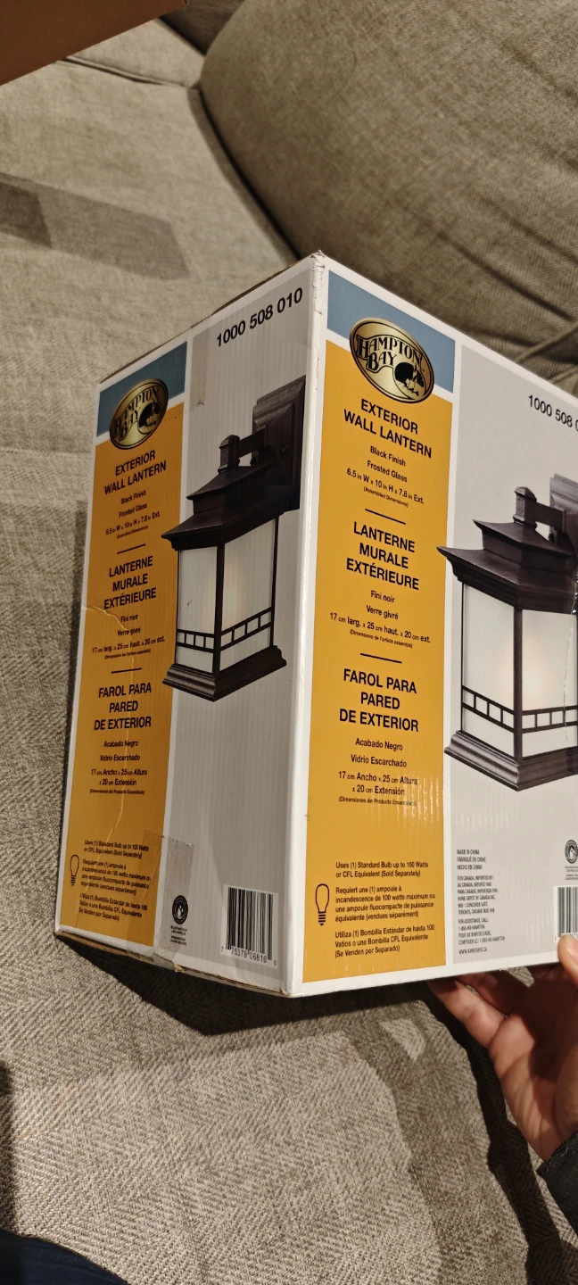 Selling a Hampton Bay exterior wall lantern in black finish! It comes in its original box. The lantern features frosted glass and measures approximately 6.5 inches in width, 10 inches in depth, and 7.8 inches in height (17 cm x 25 cm x 20 cm). Perfect for adding a touch of style to your outdoor space!