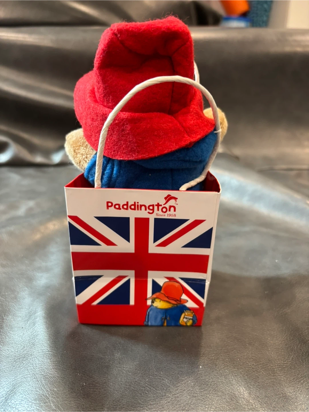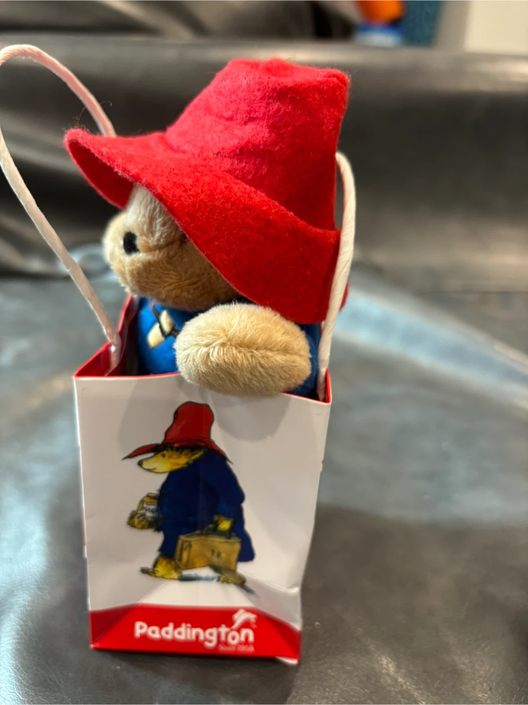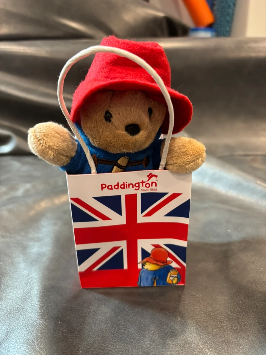 This is a cute Paddington Bear plush toy wearing his signature red hat and blue coat. It's presented in a charming gift bag featuring illustrations of Paddington and the Union Jack. A perfect little collectible for fans!