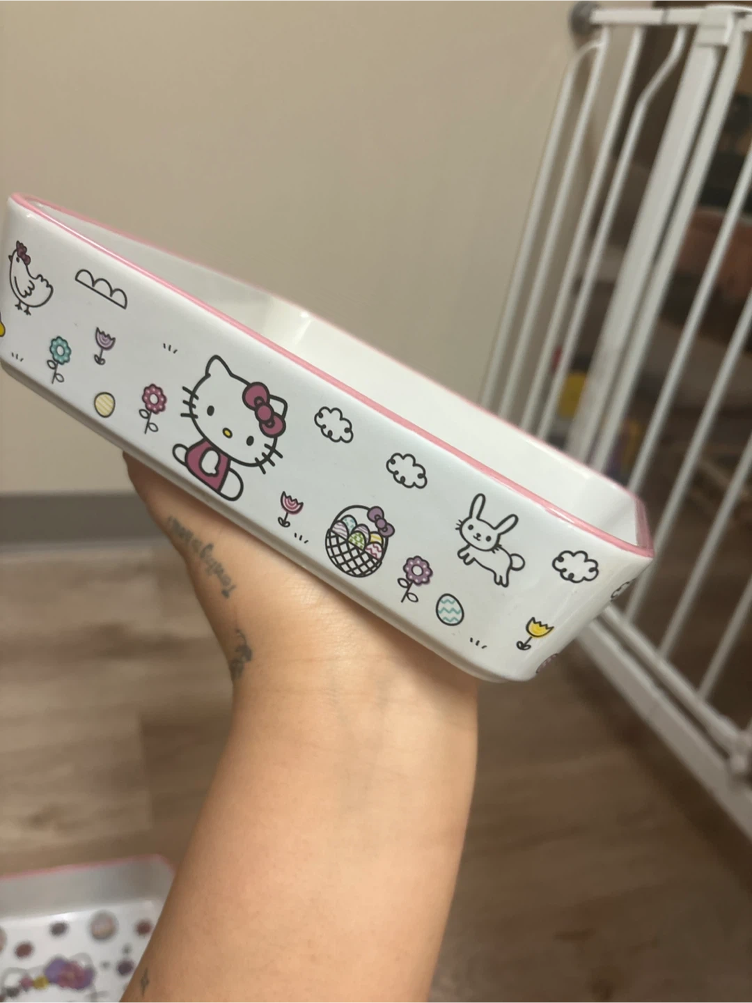 Cute Hello Kitty rectangular dish with an Easter theme. It features adorable illustrations of Hello Kitty, bunnies, and chicks. Perfect for snacks or trinkets!