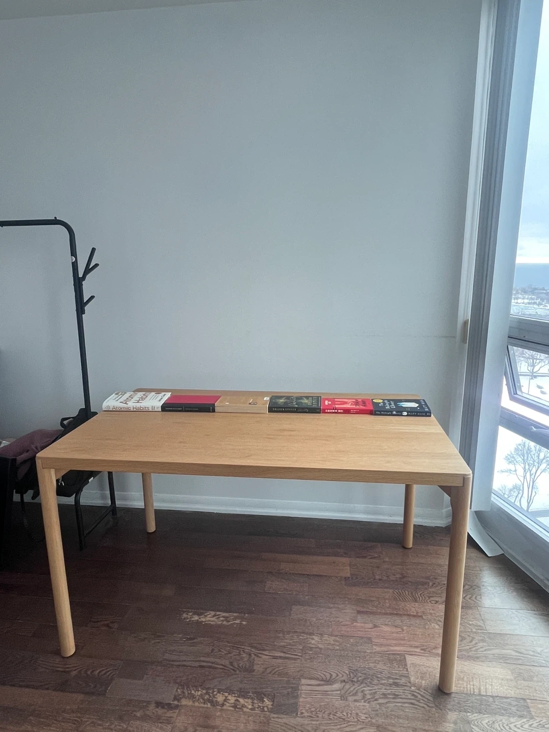 This is an IKEA RÄVAROR dining table. It's made of oak veneer and measures 81 1/8" x 30 3/4". This table is a great size for a dining area. It’s clean condition as it’s been used for study/work desk. I put books on table in photos for your size guess. The second photo is actual receipt from Ikea($199+tax).
