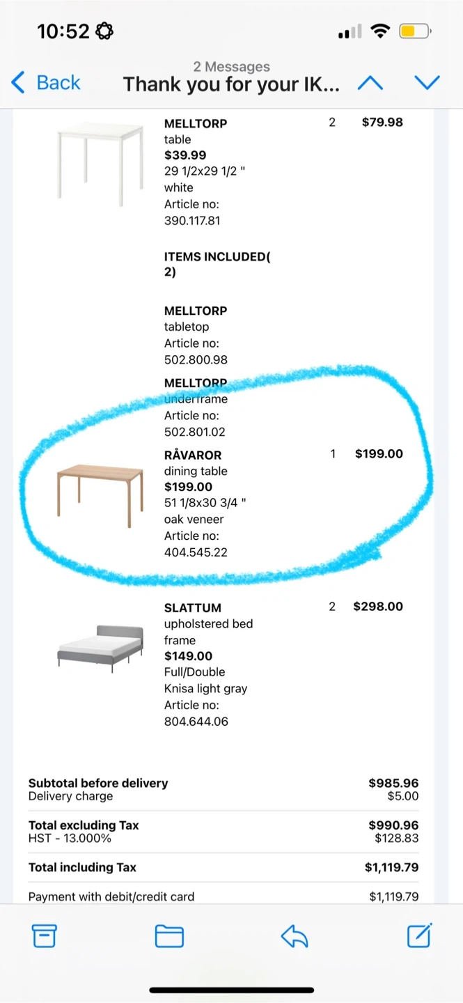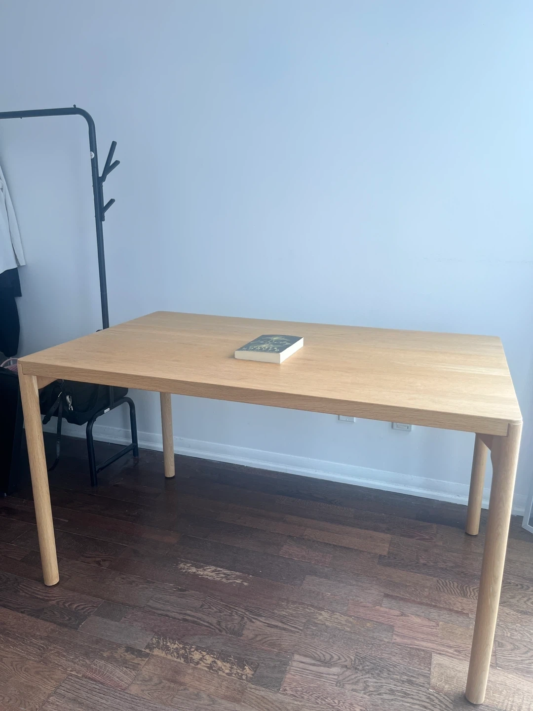 This is an IKEA RÄVAROR dining table. It's made of oak veneer and measures 81 1/8" x 30 3/4". This table is a great size for a dining area. It’s clean condition as it’s been used for study/work desk. I put books on table in photos for your size guess. The second photo is actual receipt from Ikea($199+tax).