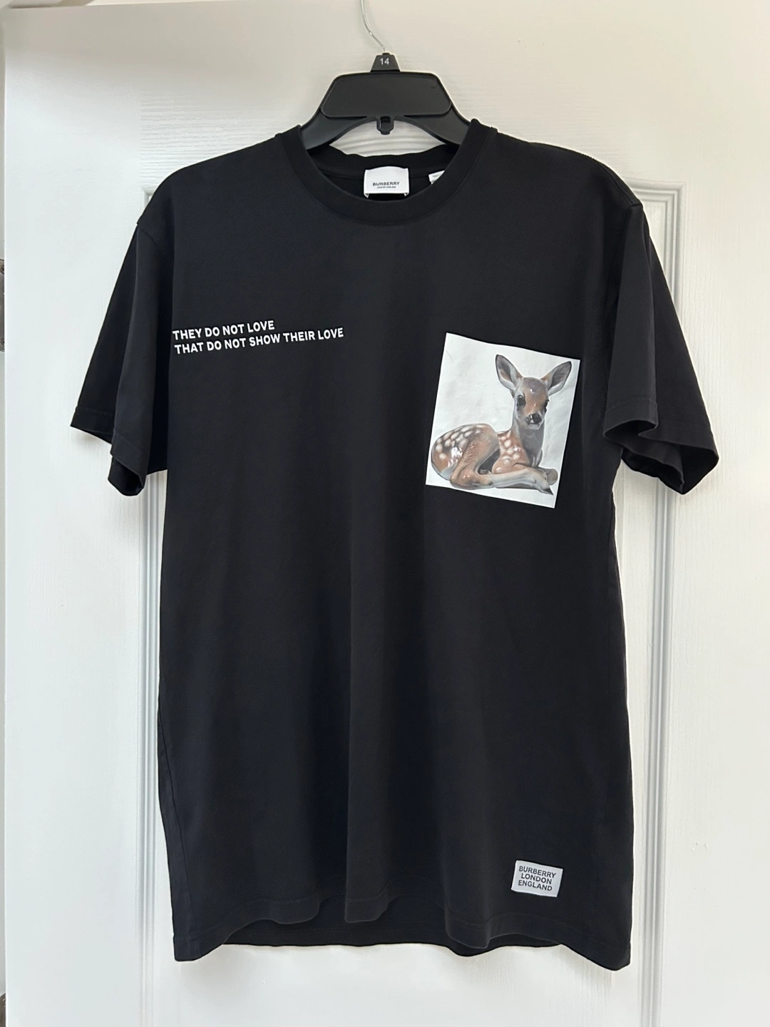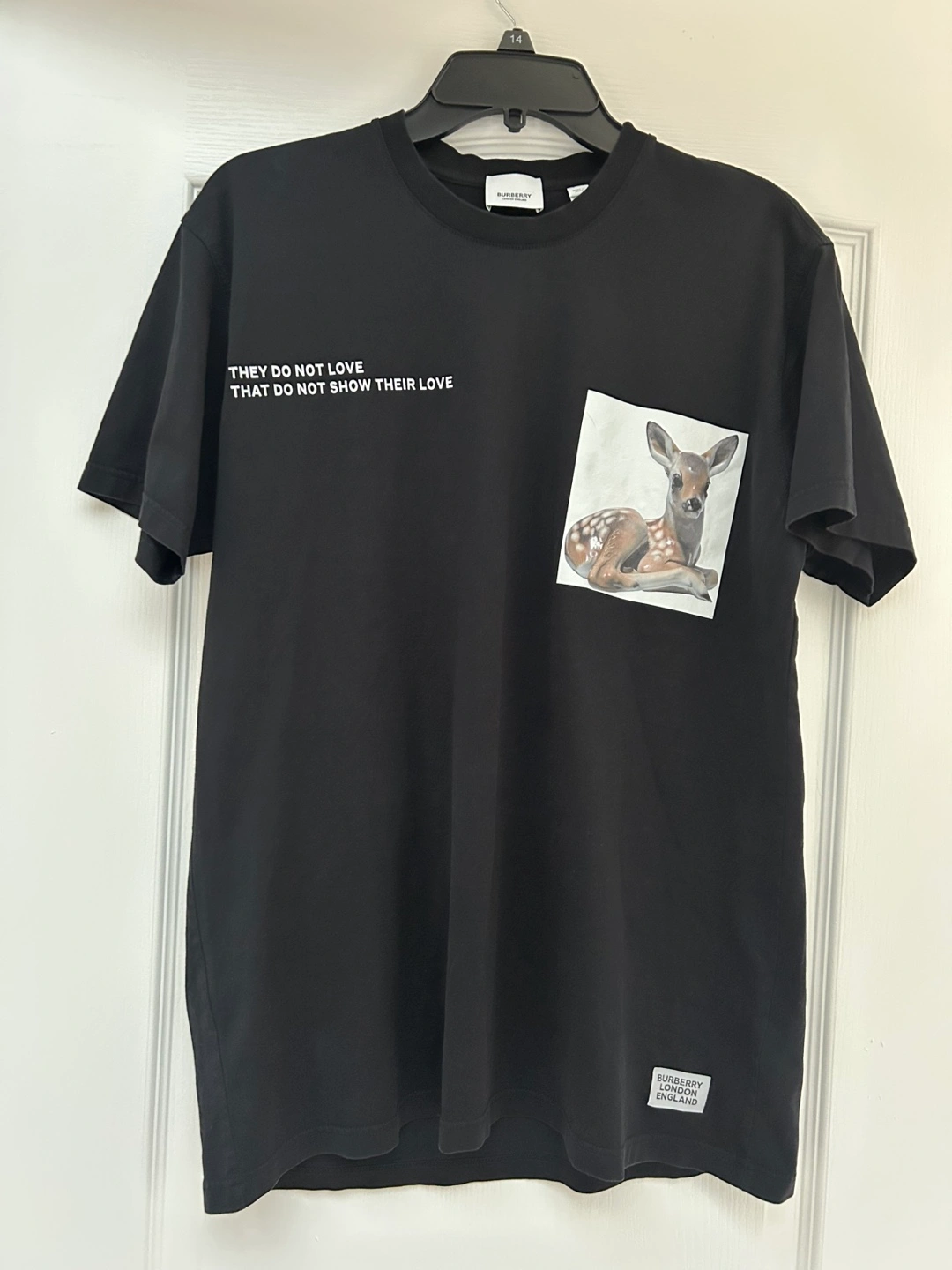 Selling a stylish Burberry black t-shirt featuring a unique deer print on the pocket. The shirt is made in Italy from 95% cotton and 5% elastane. It has a classic fit and is perfect for adding a touch of designer flair to your casual wardrobe. The shirt also has the Burberry logo on the bottom left.