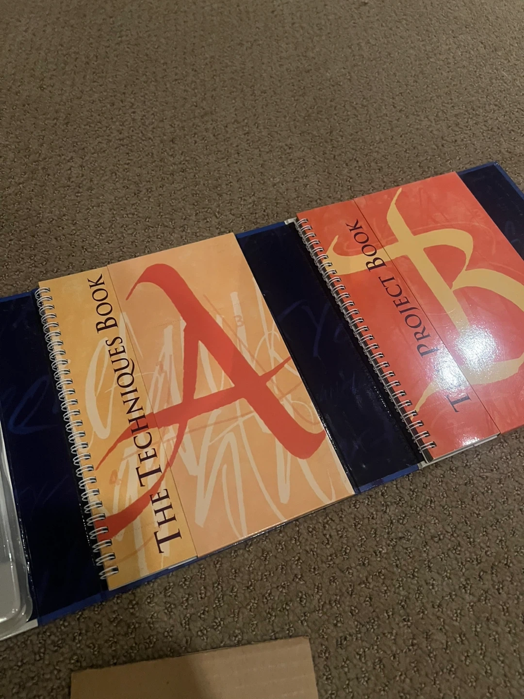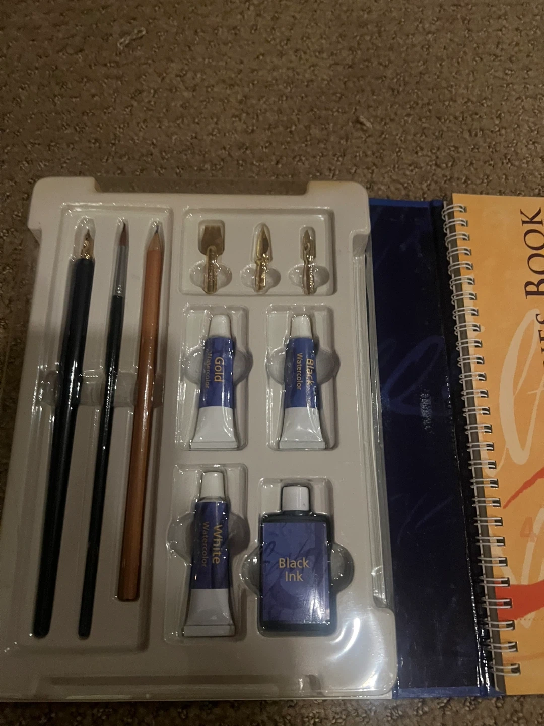 This calligraphy set includes a book titled 'Techniques, Tools, and Projects for Mastering Calligraphy' by Ann Bowen. It also comes with a black ink bottle, gold and black watercolour tubes, a pencil, brushes, and various calligraphy nibs. The set includes 'The Techniques Book' and 'The Project Book'.