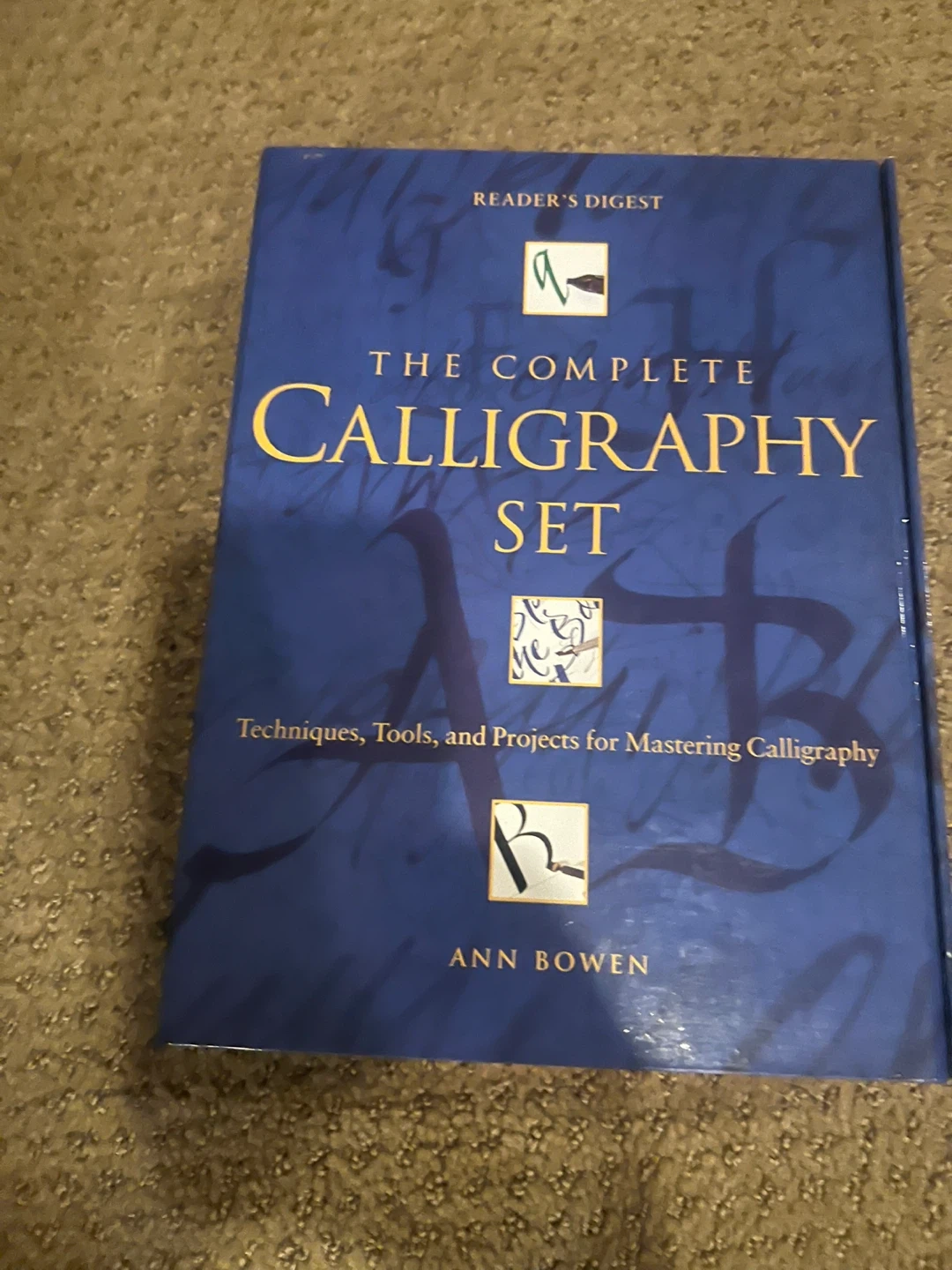 This calligraphy set includes a book titled 'Techniques, Tools, and Projects for Mastering Calligraphy' by Ann Bowen. It also comes with a black ink bottle, gold and black watercolour tubes, a pencil, brushes, and various calligraphy nibs. The set includes 'The Techniques Book' and 'The Project Book'.