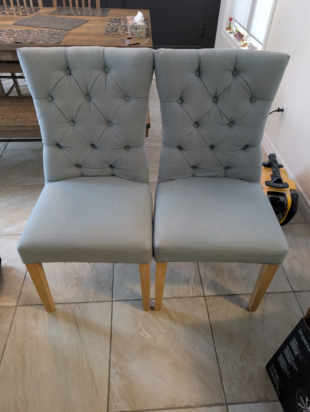 Selling a set of two upholstered dining chairs. They feature a classic design with button-tufted backs and a light blue/grey fabric. The chairs have sturdy wooden legs and a convenient handle on the back.