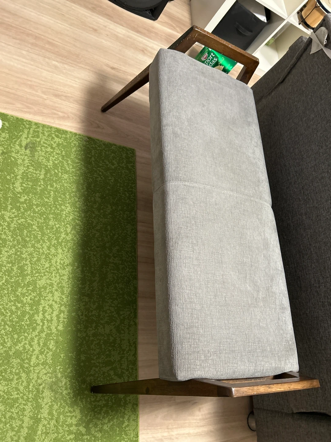 Selling a Canadel bench with a gray fabric top and wood frame! It's a stylish and functional piece for any room. The bench is made with 100% urethane foam pad. It is in used condition, with some scratches on the legs. Purchased 3 years ago from Raymond and Flanigan Furniture, 🥕🥕🥕🥕