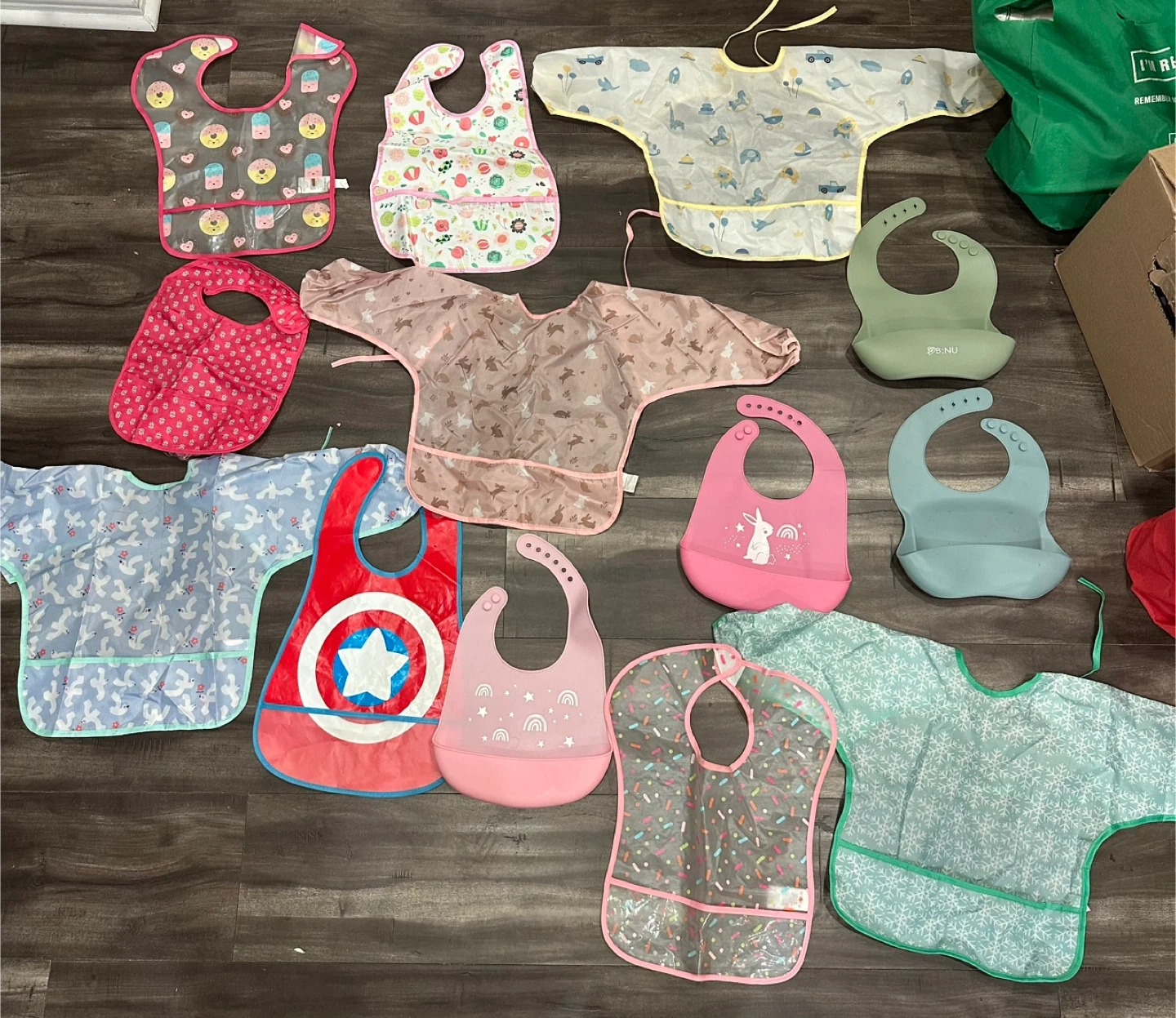 A collection of 12 baby bibs and feeding smocks in various styles and colours. Includes both fabric and waterproof options with catch-all pockets. Styles feature cartoon prints, solid colours, and character designs like Captain America.