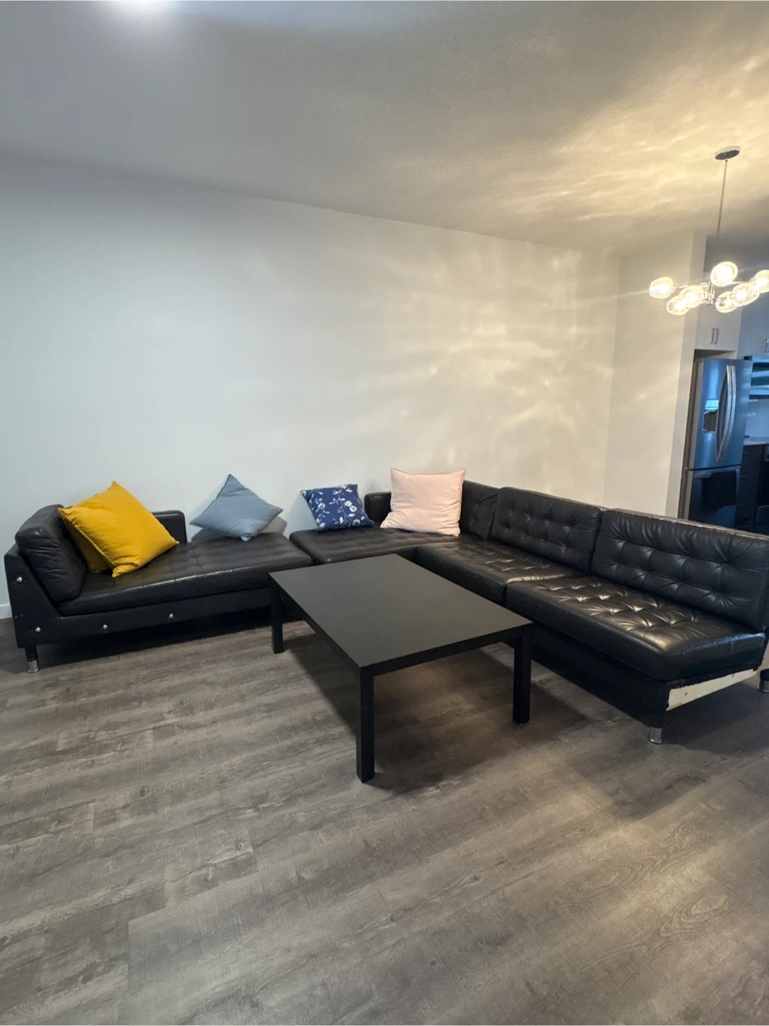 Black tufted sectional sofa with faux leather upholstery. It's a versatile piece for any living room. The faux leather material is easy to wipe clean. This sectional offers ample seating space for family and guests.