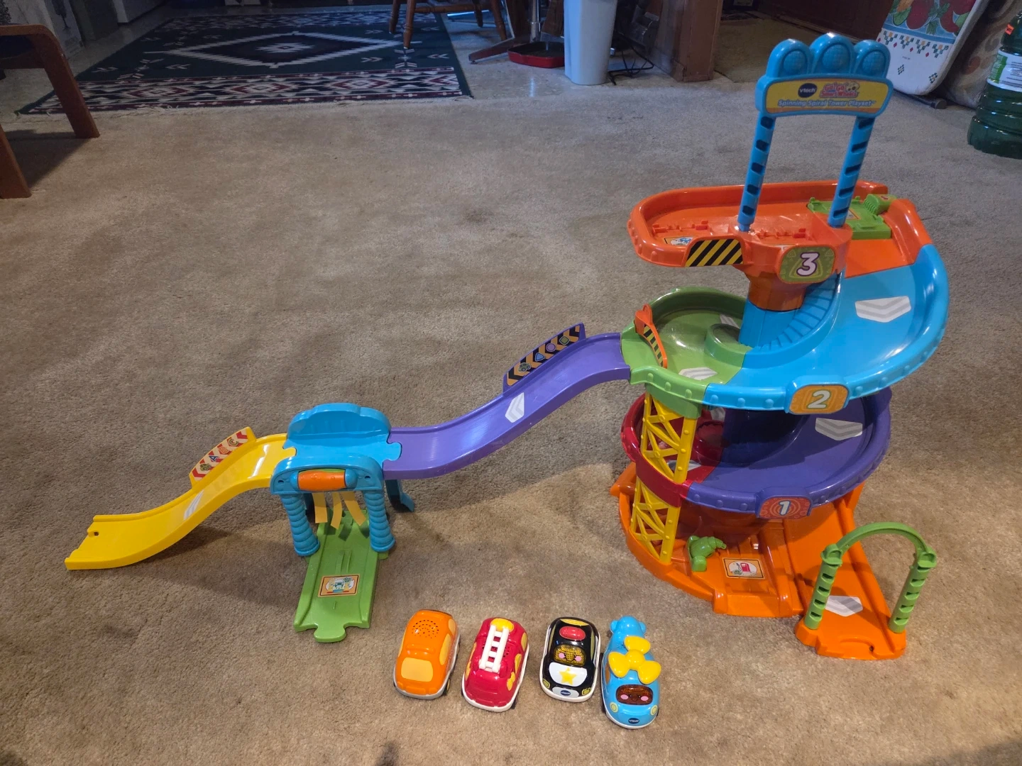 VTech Go! Go! Smart Wheels Spinning Spiral Tower playset. It has the tower with a gas pump, and car wash, ramps, and four toy cars (van, helicopter, police and firetruck).