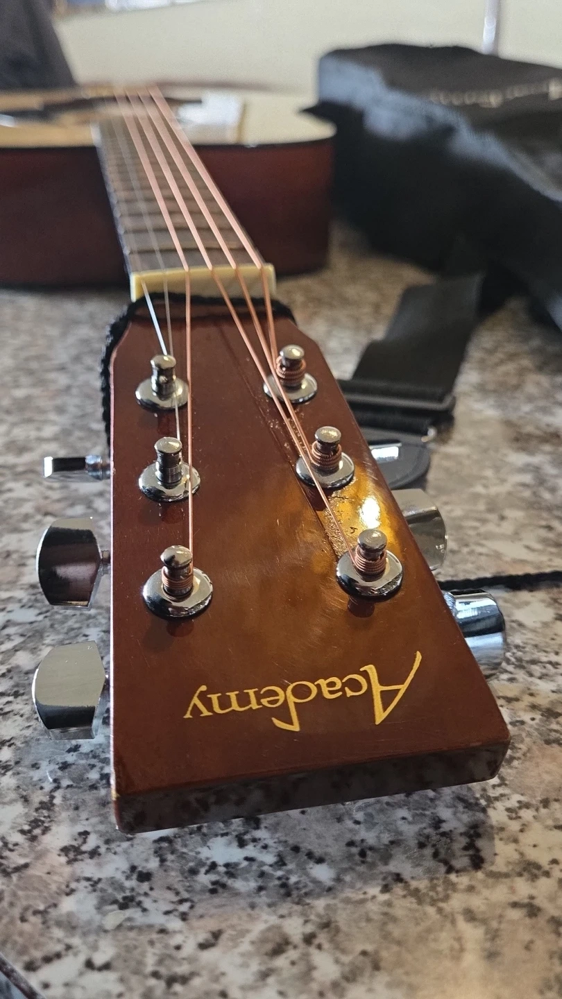 Acoustic guitar from Academy. Includes a black gig bag for transport. Six strings. Natural wood finish. Mint condition bought for son he never used it