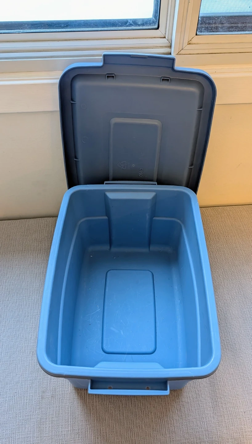 This is a blue Rubbermaid Roughneck storage bin with a lid. It's a durable plastic bin suitable for organizing various items. The lid snaps on securely to keep contents protected.