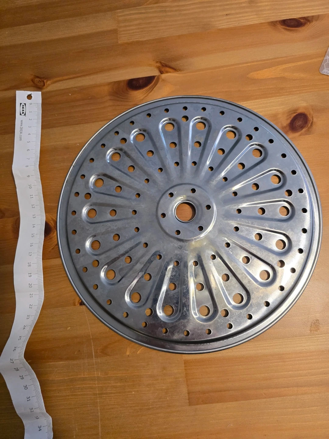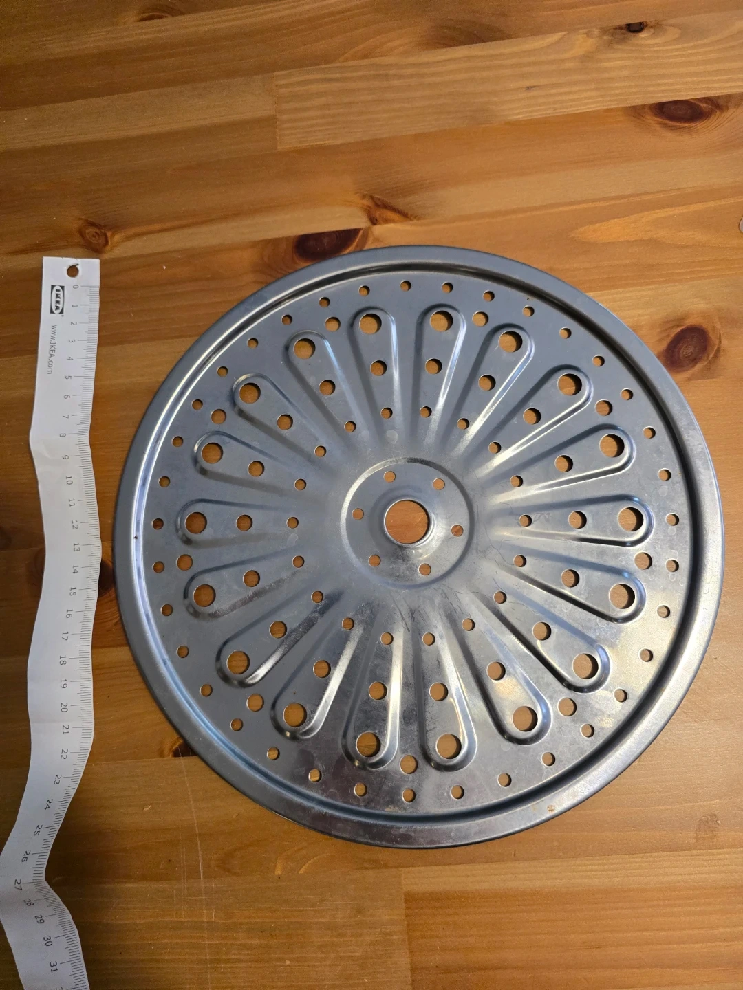 Round metal steamer insert, 25.5 cm in diameter. It's made of stainless steel and features a perforated design for steaming food. Use it for cooking vegetables or other dishes with steam!