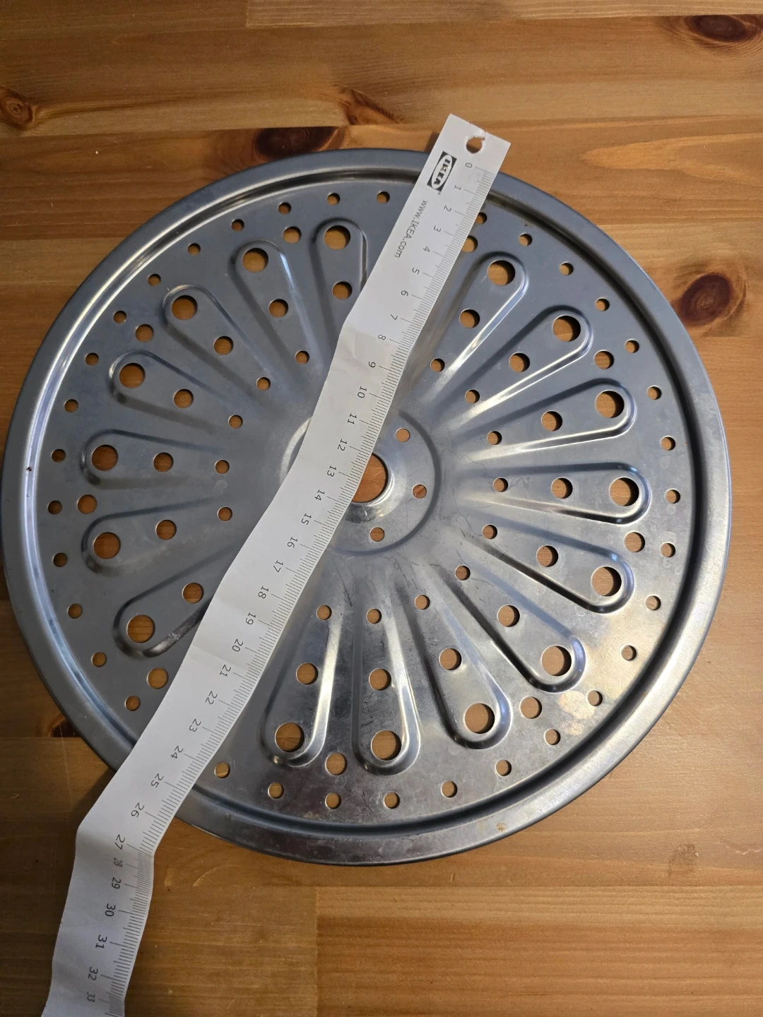 Round metal steamer insert, 25.5 cm in diameter. It's made of stainless steel and features a perforated design for steaming food. Use it for cooking vegetables or other dishes with steam!