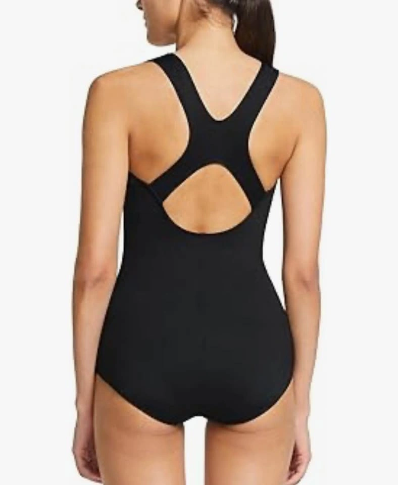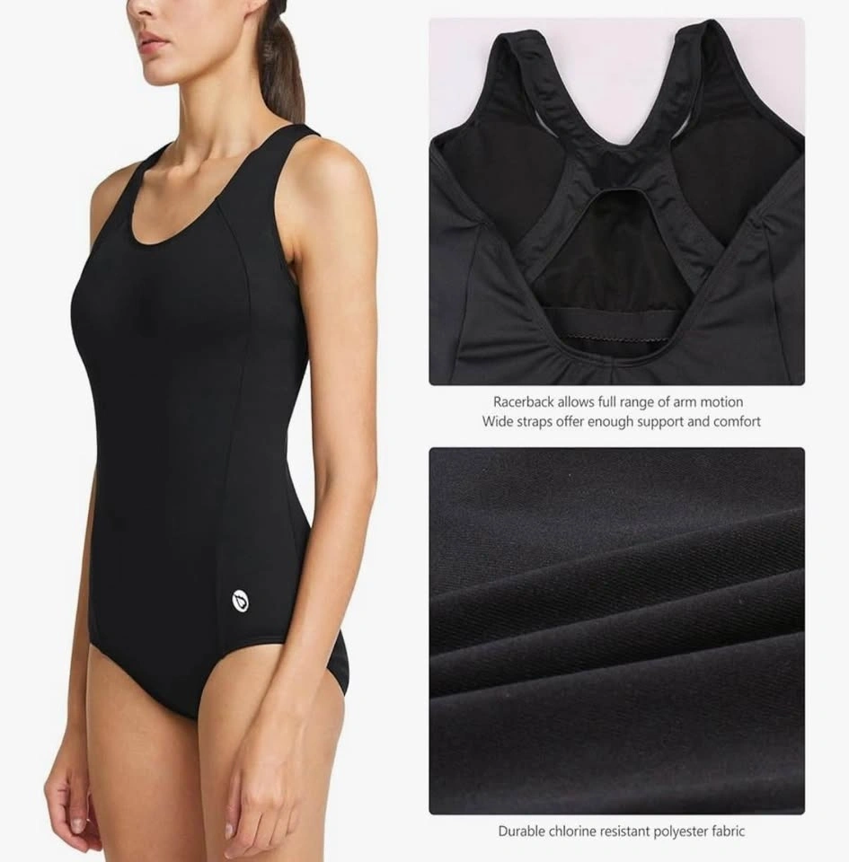 Durable chlorine-resistant fabric, athletic one-piece swimsuit designed for performance and longevity. The racerback silhouette allows for a full range of motion during laps, while wide straps provide essential support and comfort. Built-in UPF 50+ sun protection makes it ideal for both indoor and outdoor swimming sessions. The sleek black design features a modest scoop neckline and a supportive fit suitable for competitive training or fitness swimming.