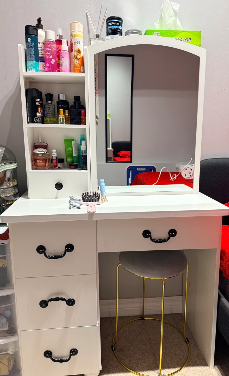 White vanity and stool with upholstered seat. Legs are white wood. Perfect for a vanity table. Use it while doing makeup or hair!