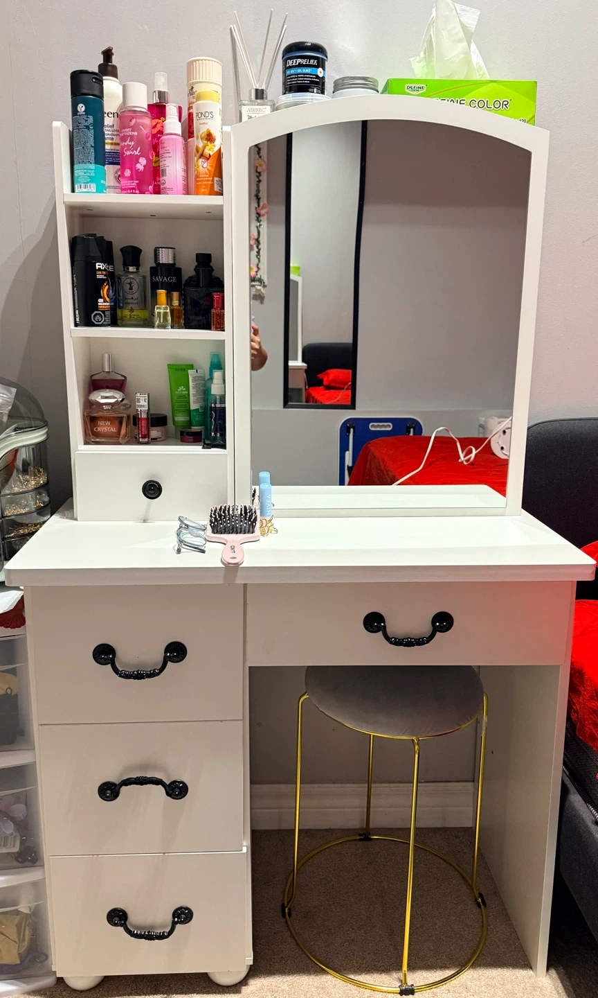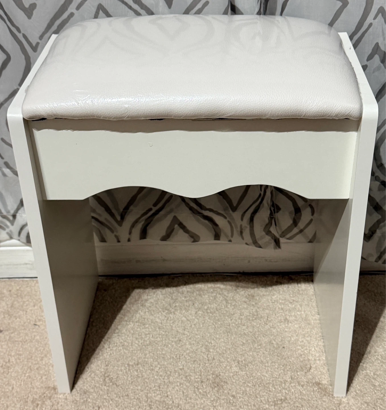 White vanity and stool with upholstered seat. Legs are white wood. Perfect for a vanity table. Use it while doing makeup or hair!