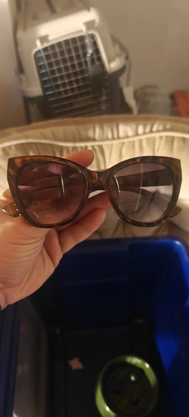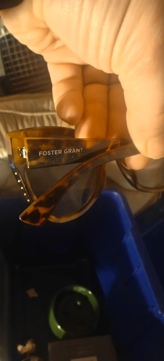 These Foster Grant sunglasses have a tortoiseshell pattern and a cat-eye design. They're a stylish accessory for sunny days! Plastic frame.