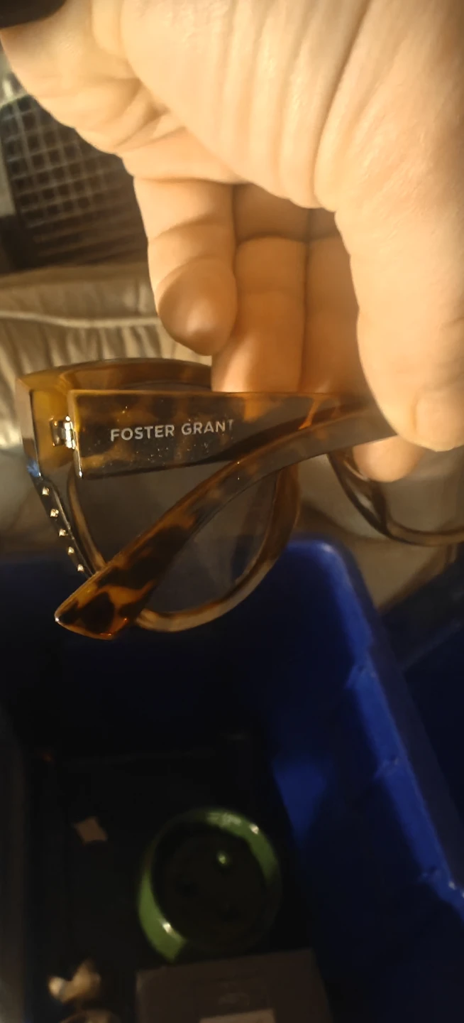 These Foster Grant sunglasses have a tortoiseshell pattern and a cat-eye design. They're a stylish accessory for sunny days! Plastic frame.