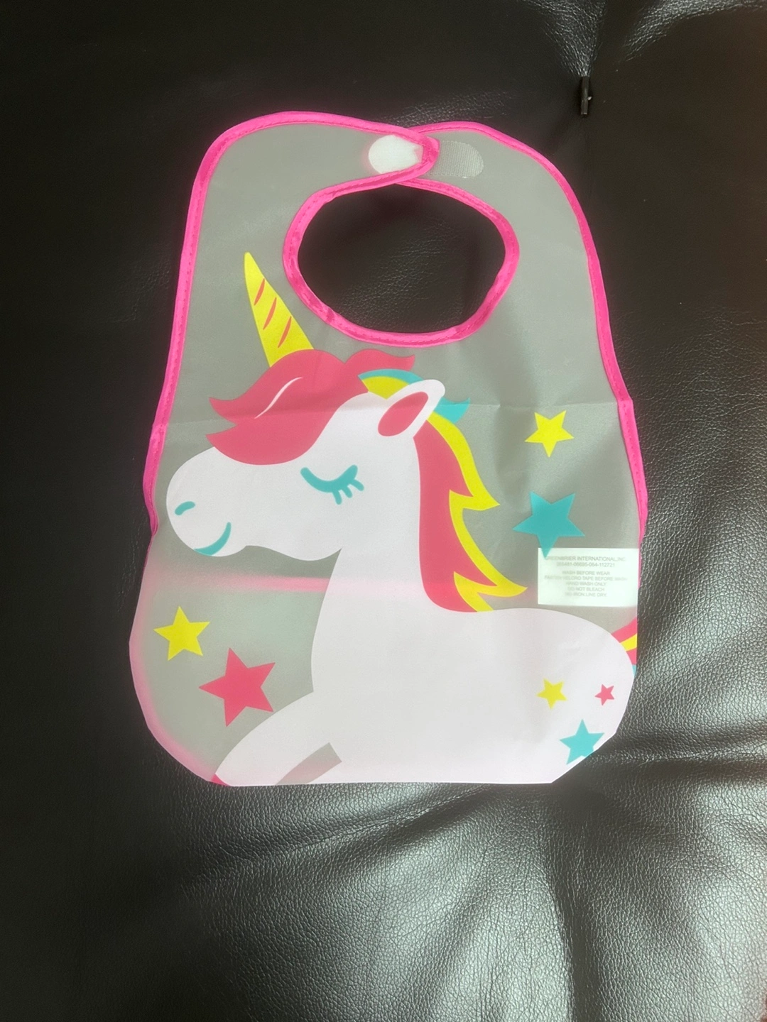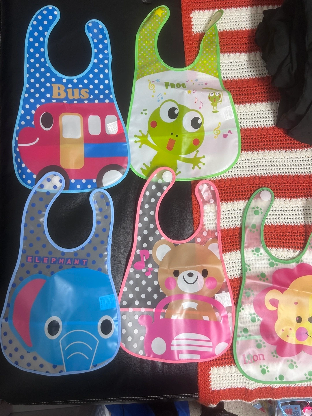 Set of 9 colourful baby bibs with various animal and vehicle designs. Waterproof and easy to clean.