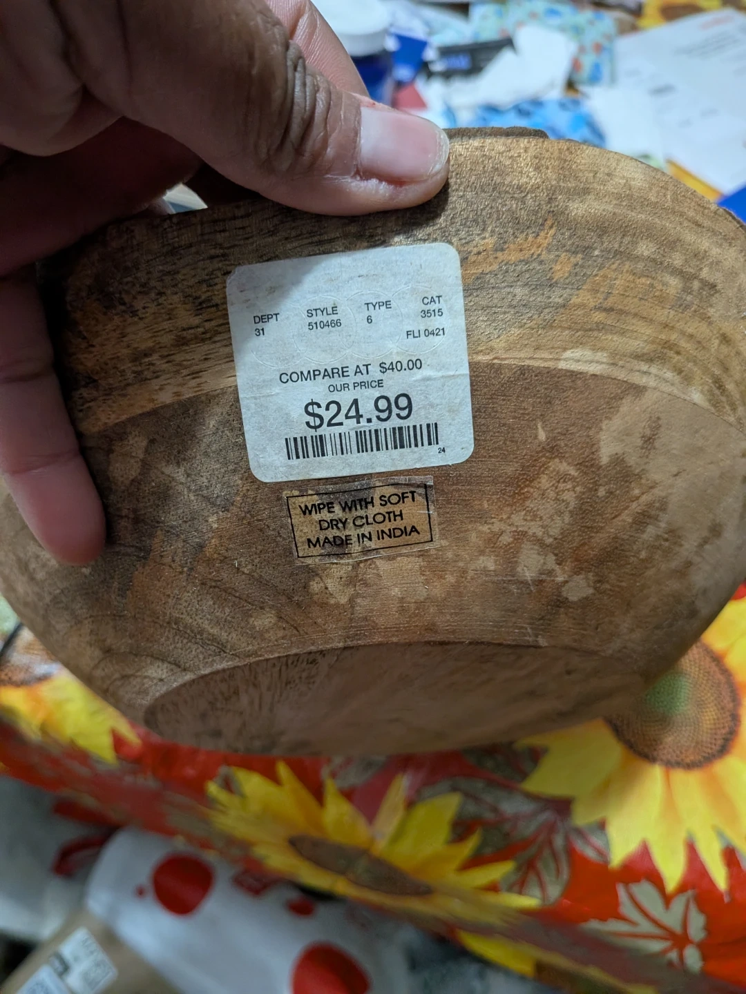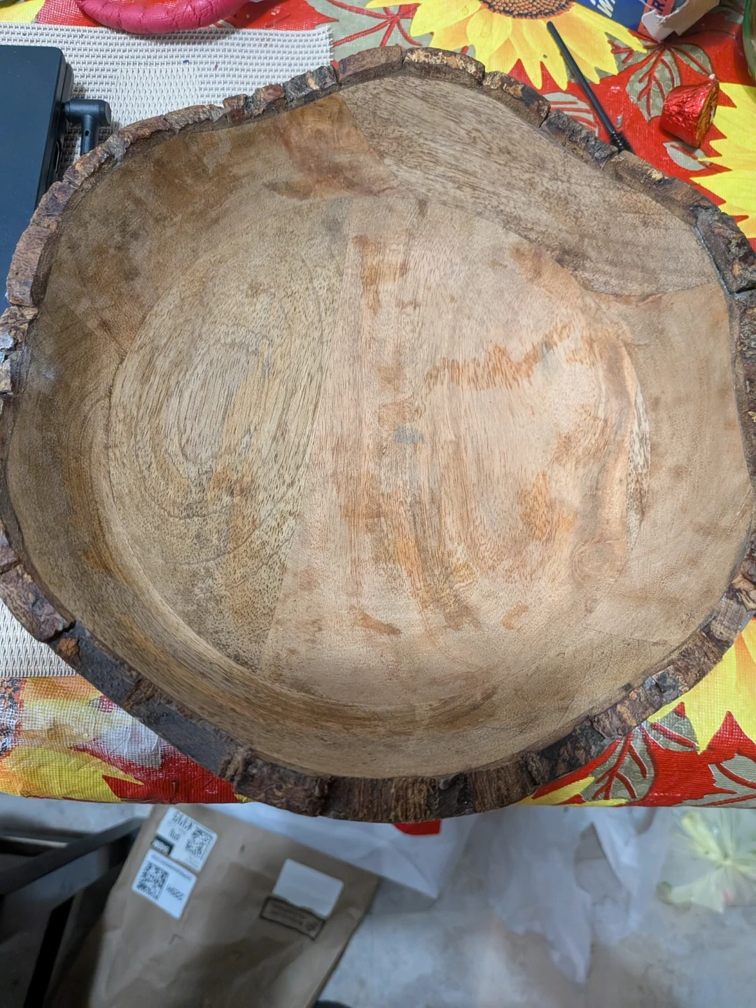 This is a rustic wooden salad bowl, made in India. It's perfect for serving salads or as a decorative centerpiece. Wipe clean with a soft, dry cloth.