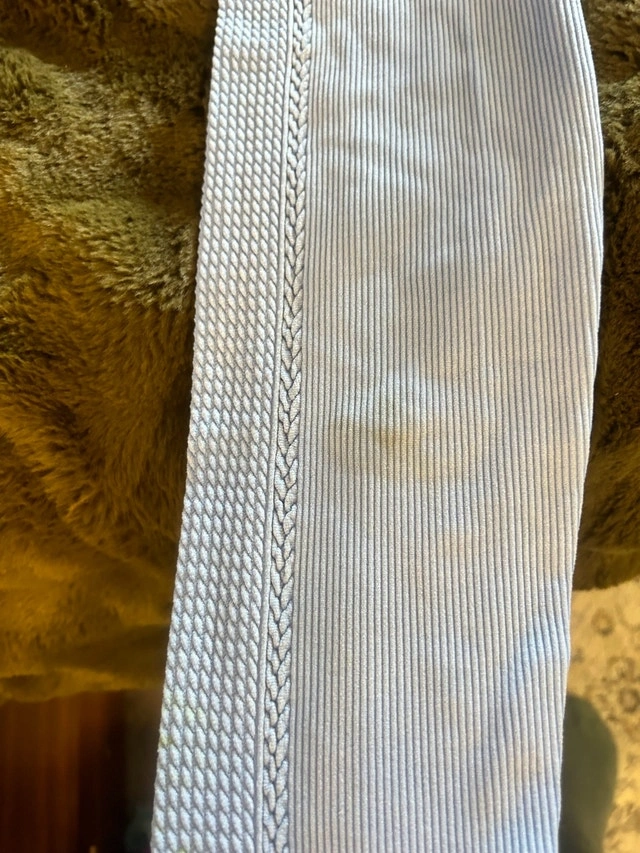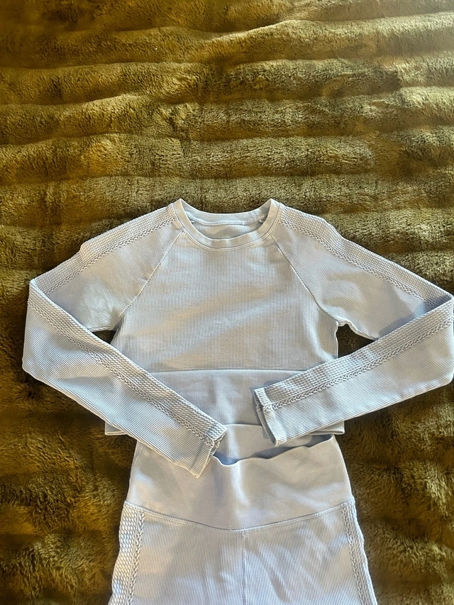 This used Aerie workout set in baby blue, size small, is ready for your next sweat session! The long-sleeved crop top and matching leggings are perfect for yoga, running, or just lounging around. The set has a ribbed texture and a flattering fit. Please note that there is a small stain on the sleeve. Size: Small Colour: Baby Blue Brand: Aerie