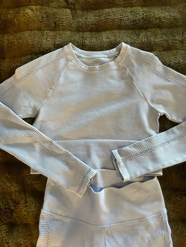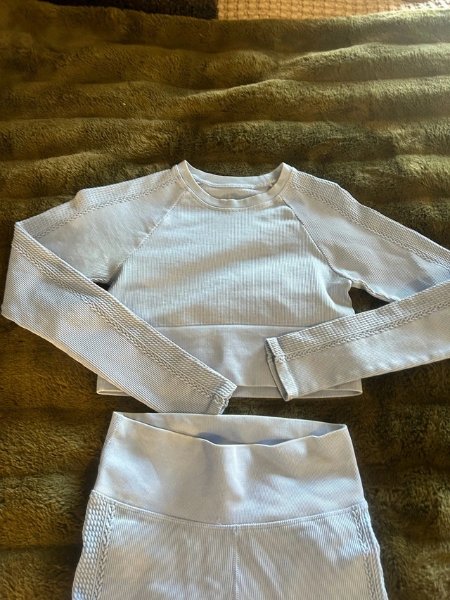 This used Aerie workout set in baby blue, size small, is ready for your next sweat session! The long-sleeved crop top and matching leggings are perfect for yoga, running, or just lounging around. The set has a ribbed texture and a flattering fit. Please note that there is a small stain on the sleeve. Size: Small Colour: Baby Blue Brand: Aerie