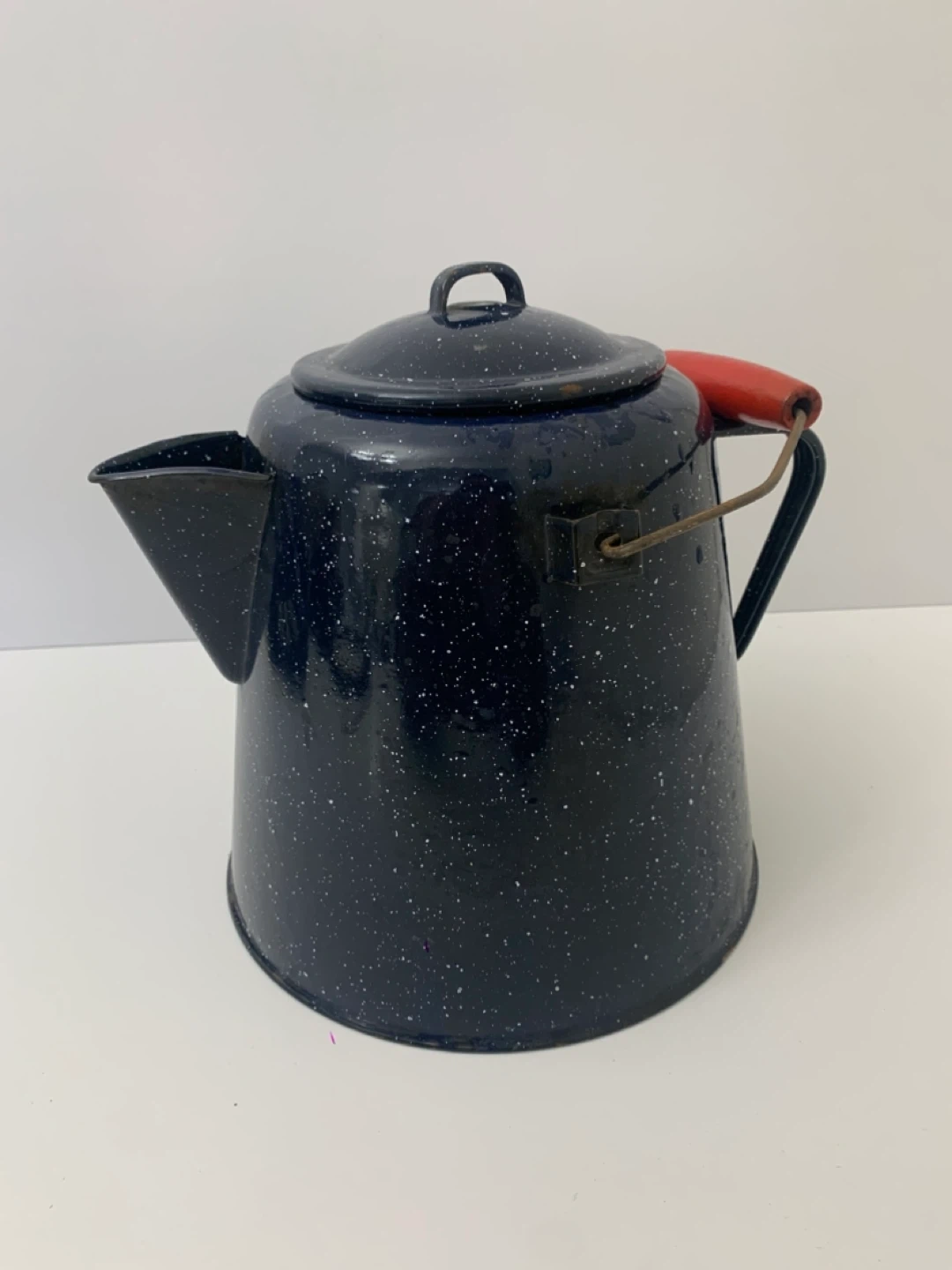A dark blue speckled enamelware coffee pot. It has a red handle and a traditional pour spout. Great for camping or rustic kitchen decor!