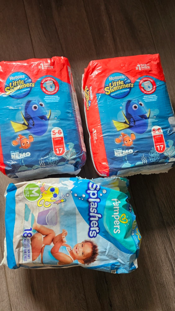 Selling two packs of Huggies Little Swimmers size 5-6 (Large) with 17 diapers each, and one pack of Pampers Splashers size M with 9 left disposable swim pants. Perfect for your little one's swim time!