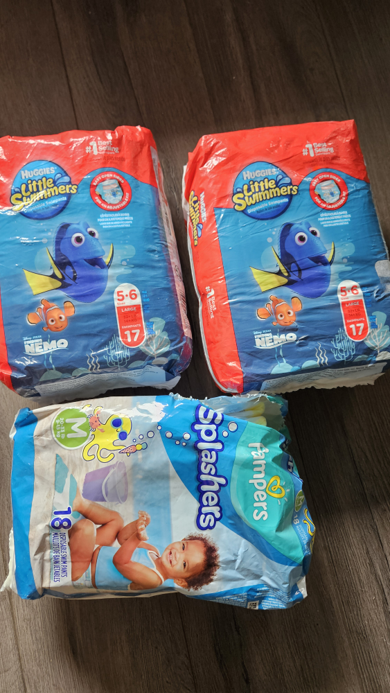 Selling two packs of Huggies Little Swimmers size 5-6 (Large) with 17 diapers each, and one pack of Pampers Splashers size M with 9 left disposable swim pants. Perfect for your little one's swim time!