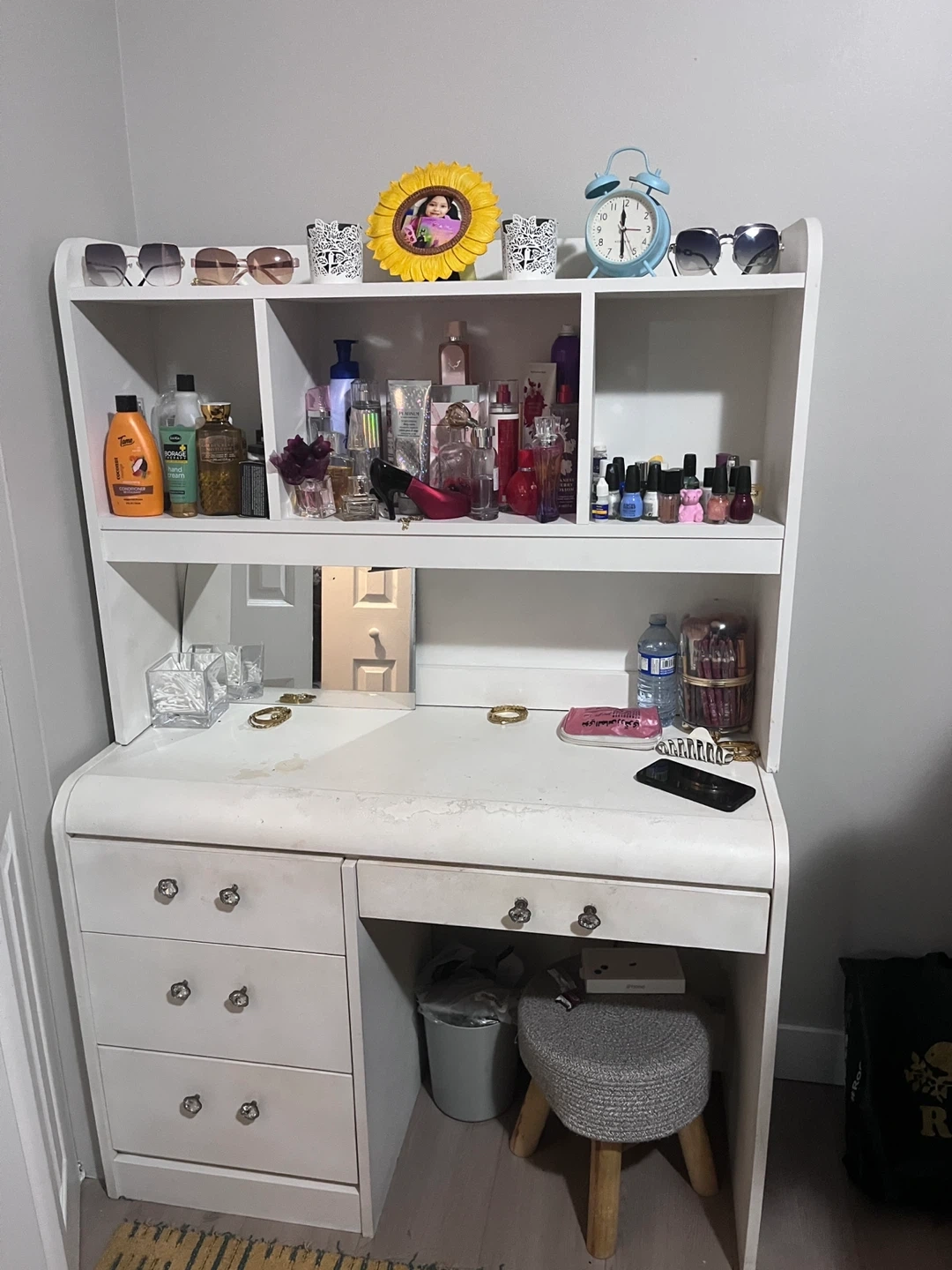 Selling a white vanity desk with built-in shelves. It's a great piece for organizing your makeup and accessories. It has some signs of use on the top surface, but otherwise in good condition. Would be perfect for a bedroom or dressing area!
