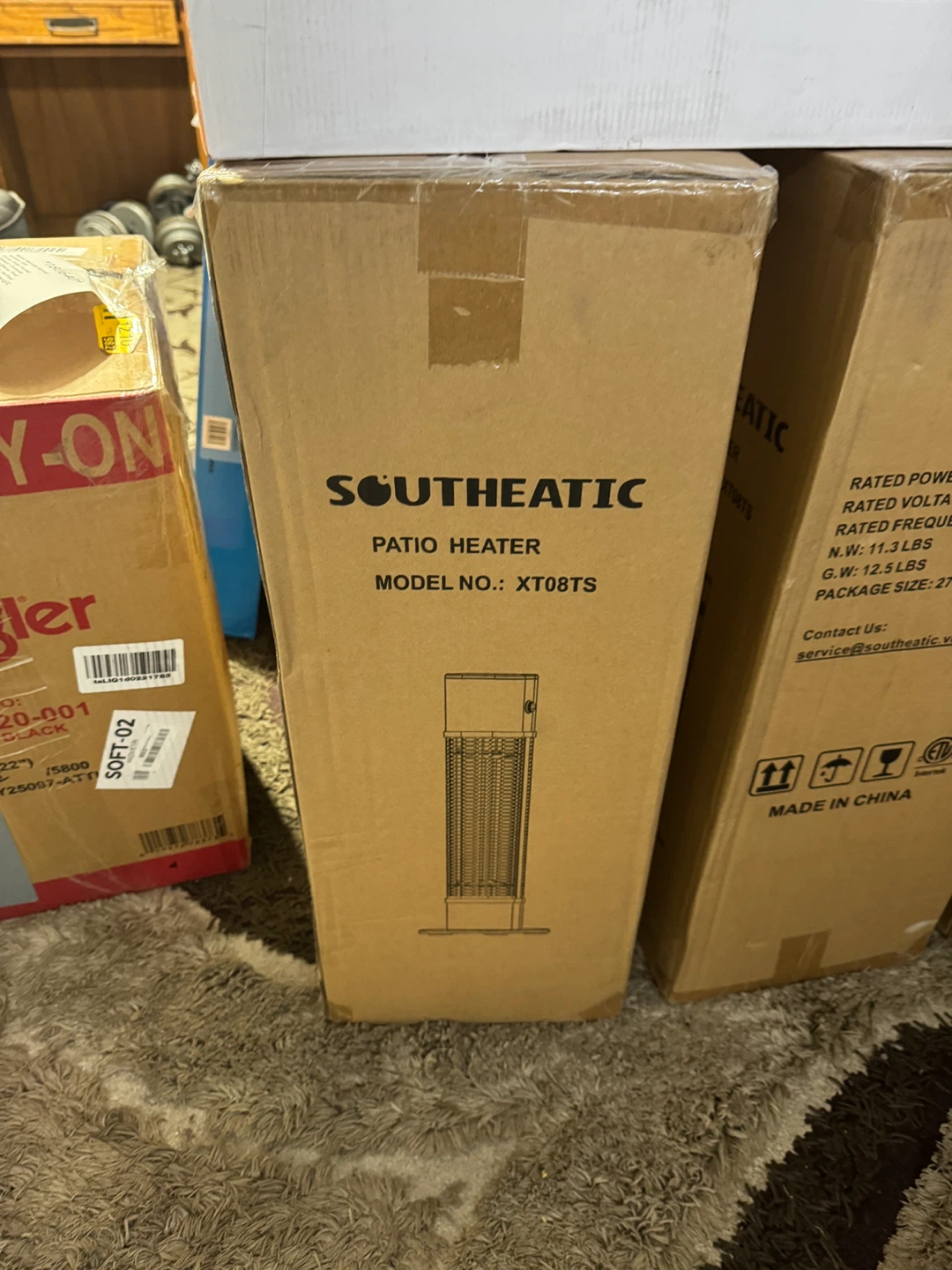 This SOUTHEATIC patio heater is designed for outdoor use. It's model XT08TS and comes in a black finish. It's great for extending the enjoyment of your patio or balcony during cooler evenings. Made in China.