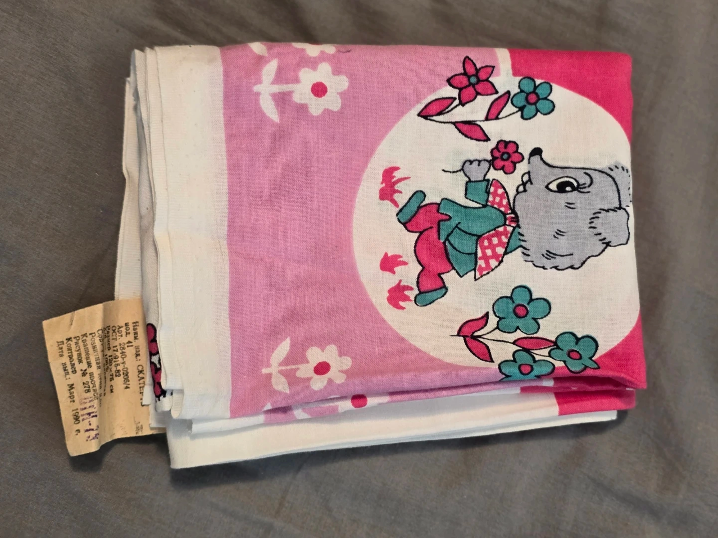 It's 100% cotton and measures 120x75 cm. The tag indicates it was made in March 1990. It features a charming design with pink accents and cute cartoon characters