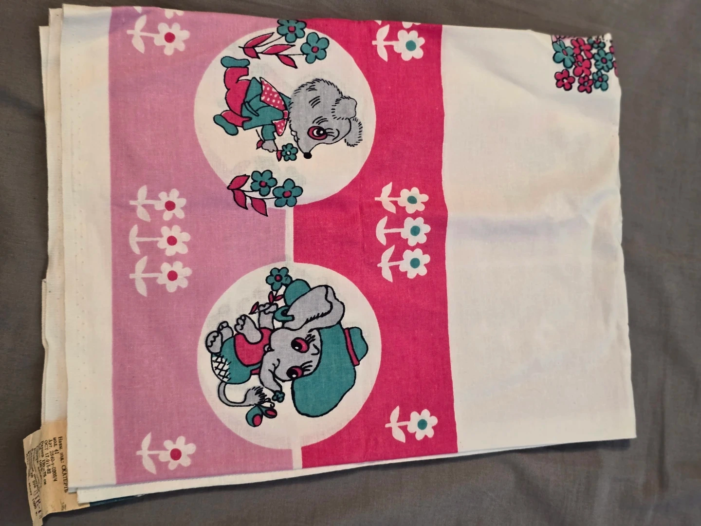It's 100% cotton and measures 120x75 cm. The tag indicates it was made in March 1990. It features a charming design with pink accents and cute cartoon characters