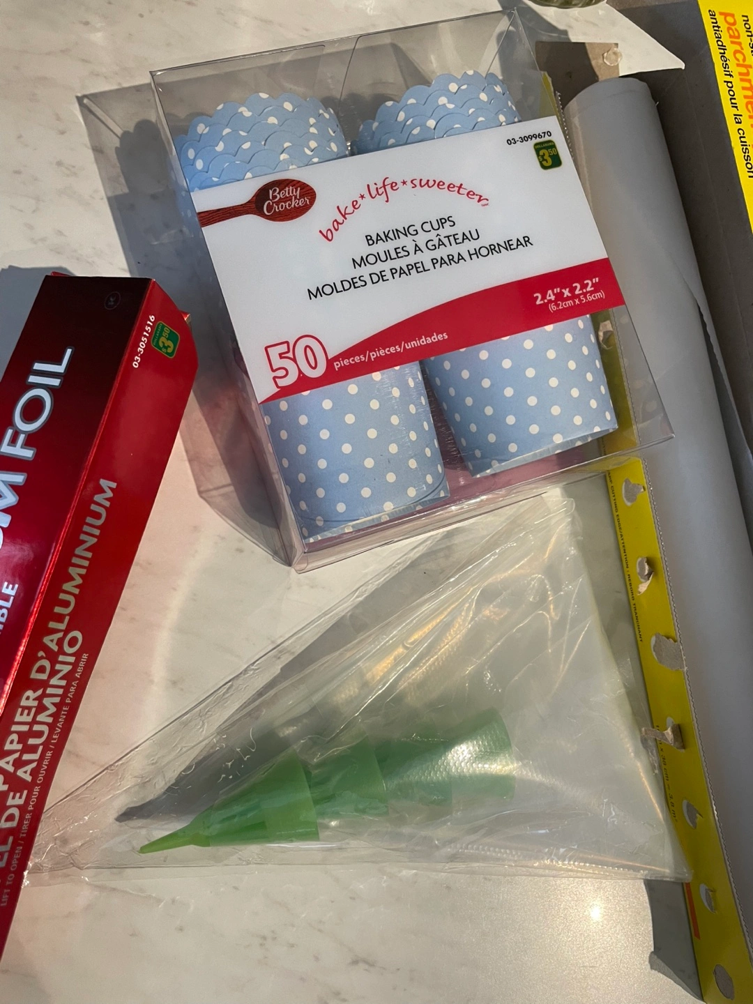 Includes 50 blue polka dot baking cups by Betty Crocker, a roll of non-stick parchment paper (10m), and a roll of aluminum foil. A piping bag and tips are also included.