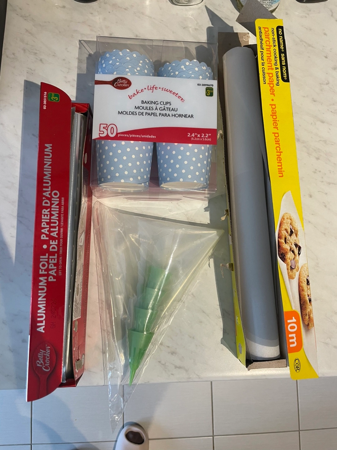 Includes 50 blue polka dot baking cups by Betty Crocker, a roll of non-stick parchment paper (10m), and a roll of aluminum foil. A piping bag and tips are also included.