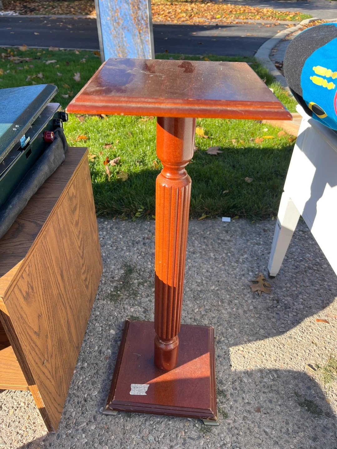 Selling a wooden plant stand in brown. It has a square top and base with a decorative column. Perfect for adding a touch of elegance to your plants!