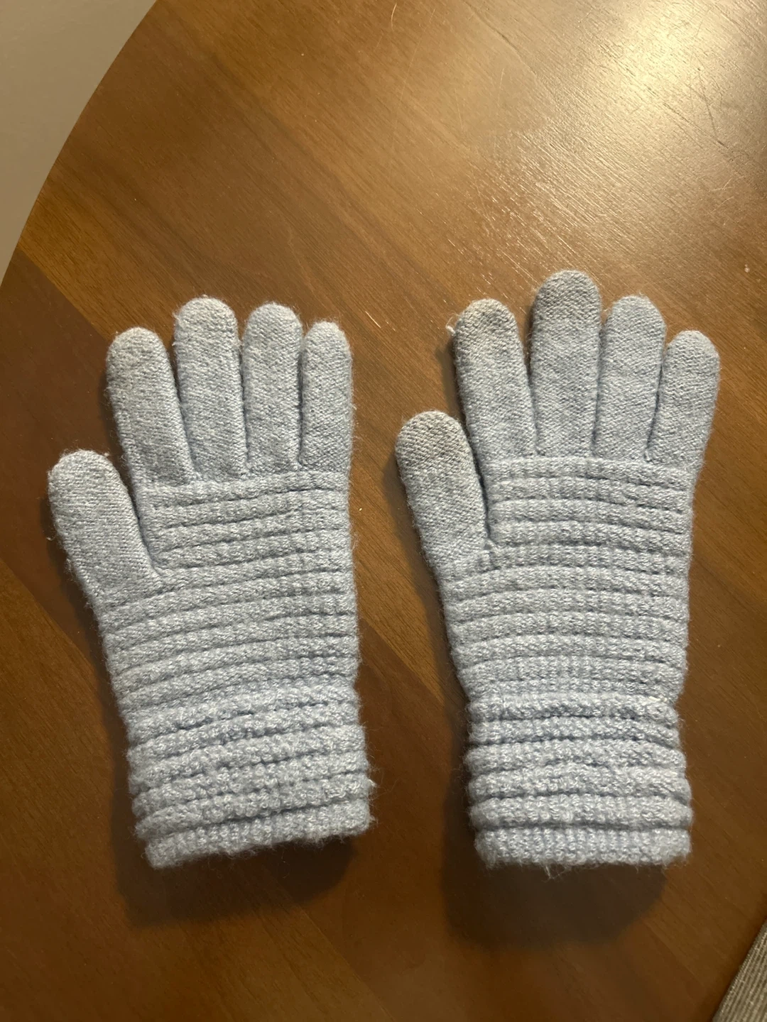 A pair of light blue knit gloves. These gloves are made from a soft, textured knit fabric. They offer a comfortable fit for everyday wear. Perfect for keeping hands warm on cooler days!