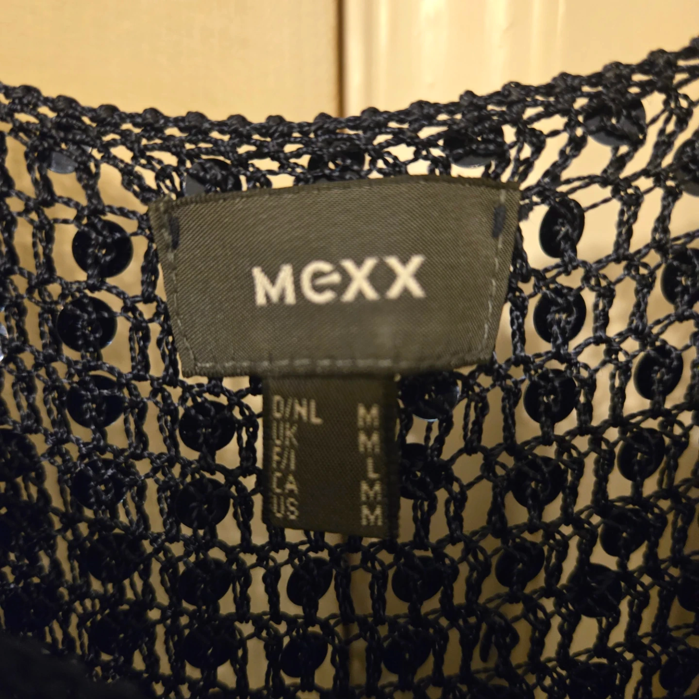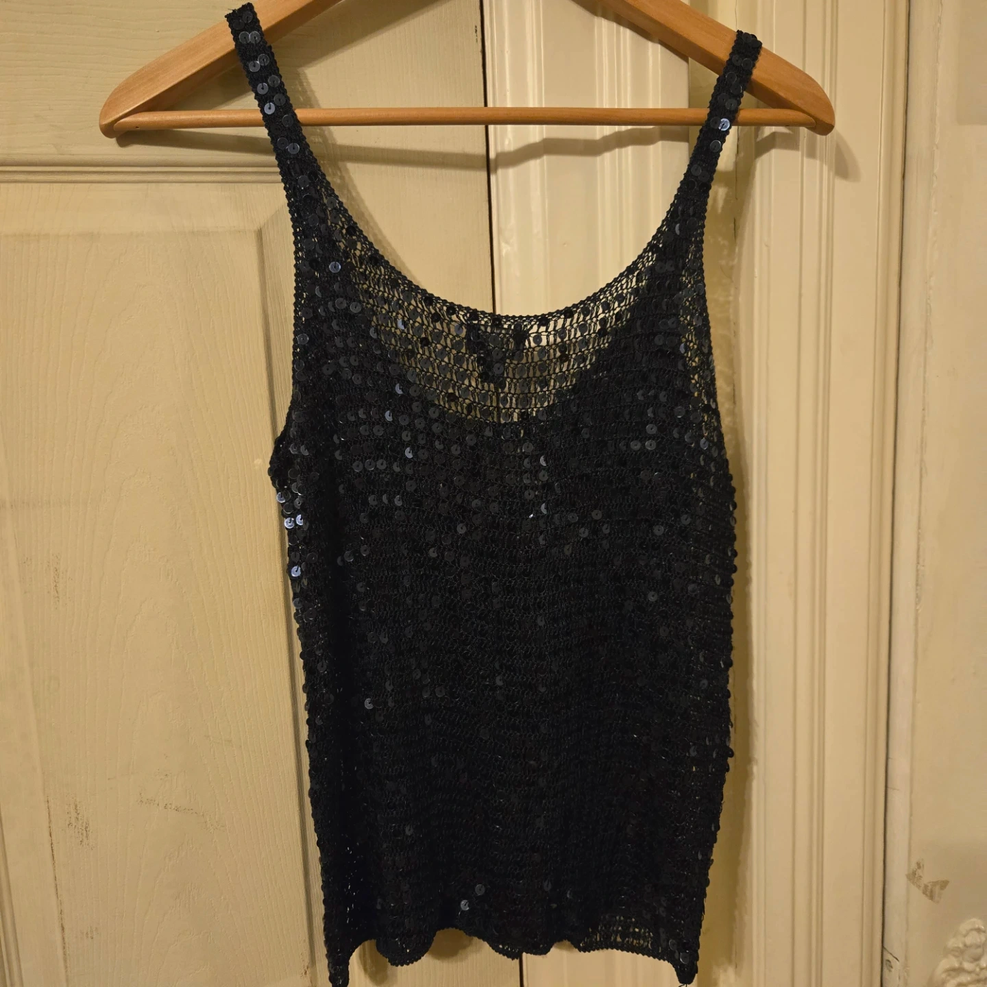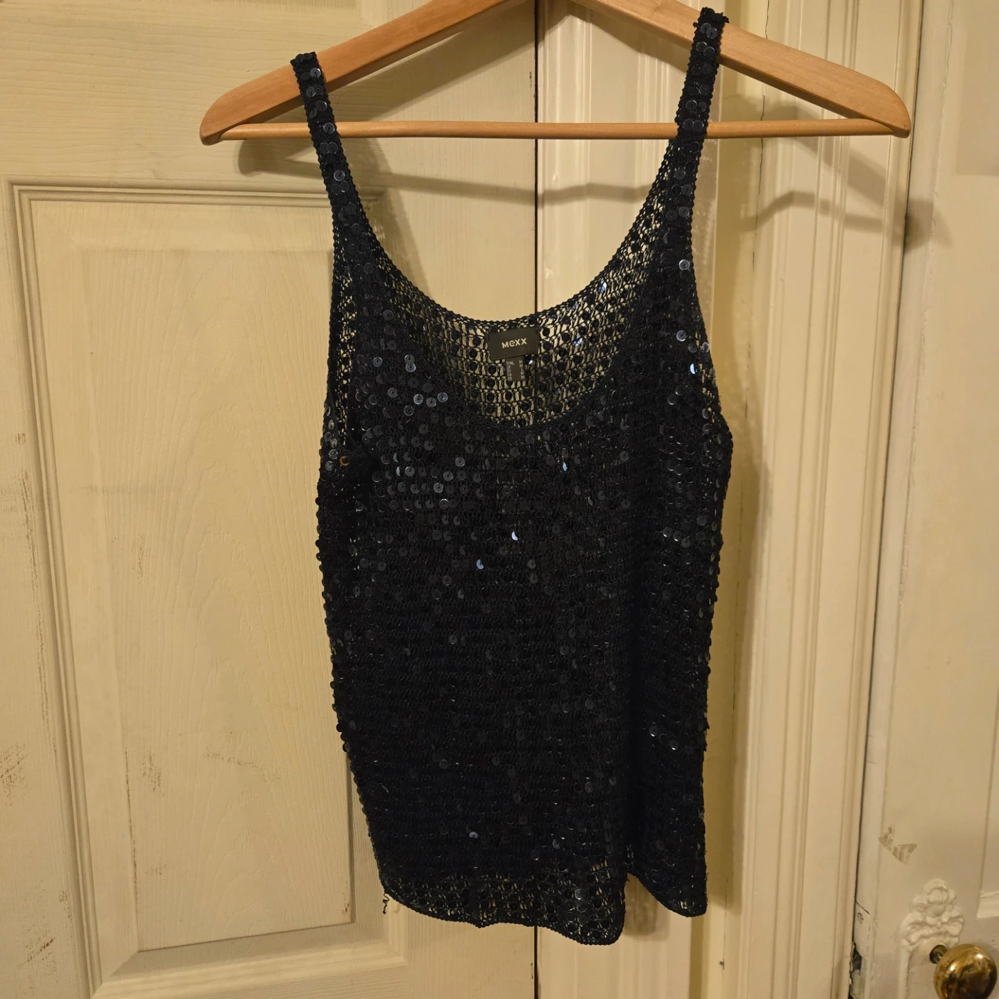 This dark navy blue sequin knit tank top is from Mexx. It's a size medium. Perfect for layering or wearing on its own for a bit of sparkle!