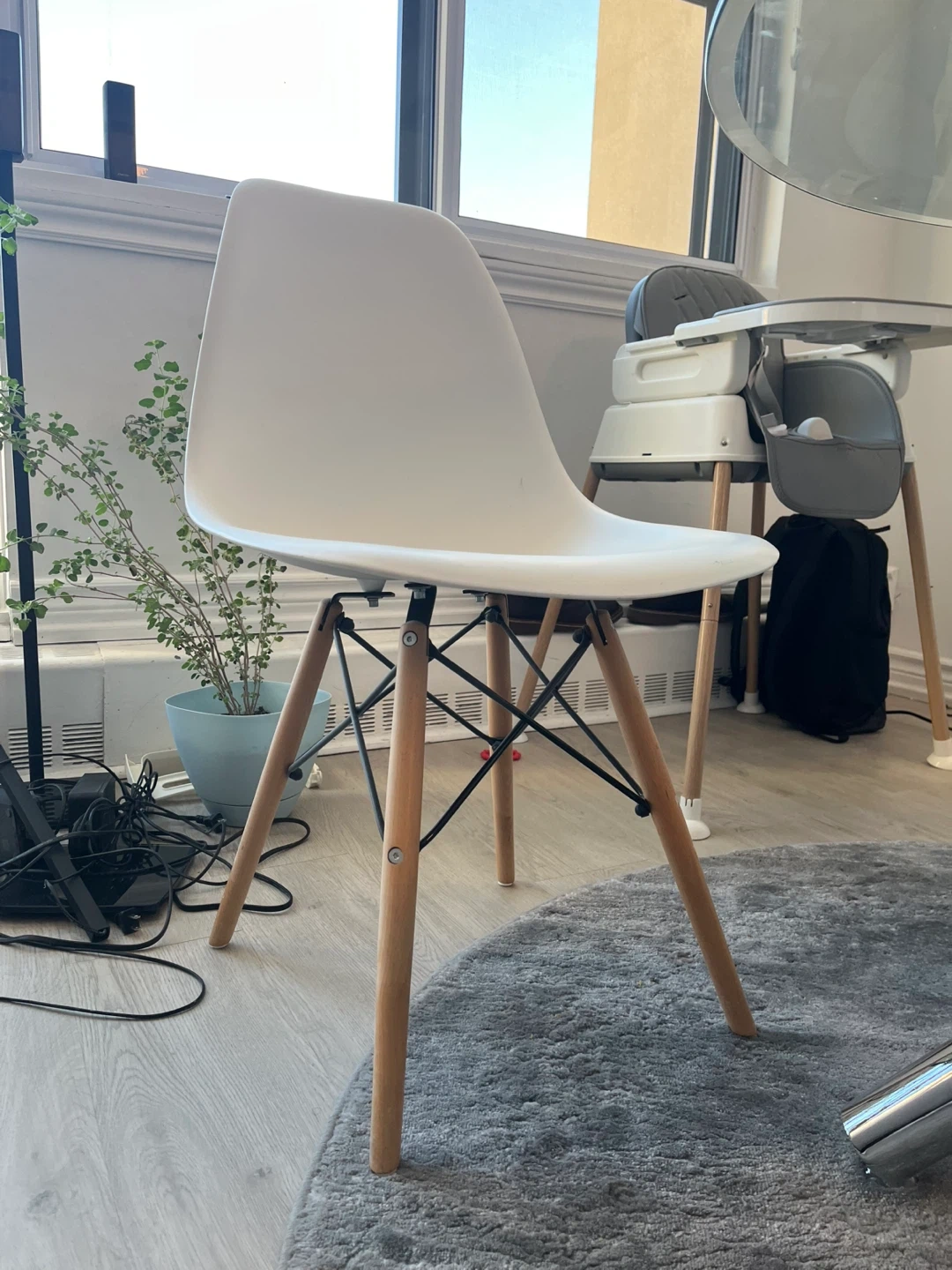 Four-piece dining set with a round glass tabletop and chrome base. Includes four white modern chairs with wooden legs. This set is great for small dining areas or kitchens.