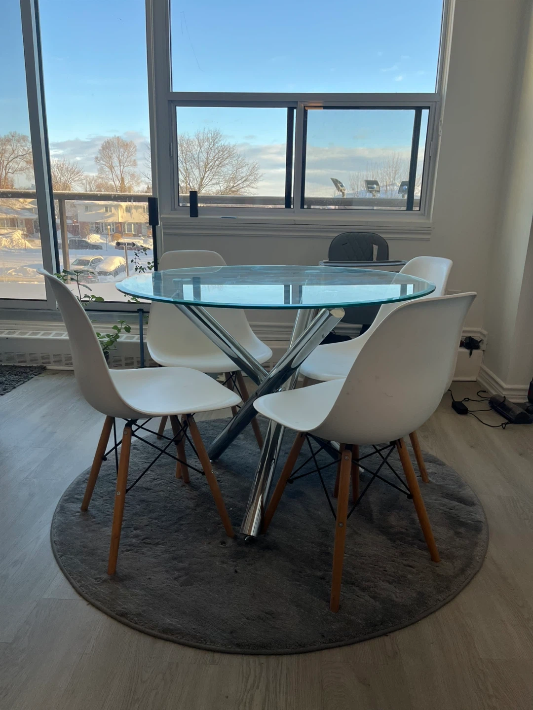 Four-piece dining set with a round glass tabletop and chrome base. Includes four white modern chairs with wooden legs. This set is great for small dining areas or kitchens.